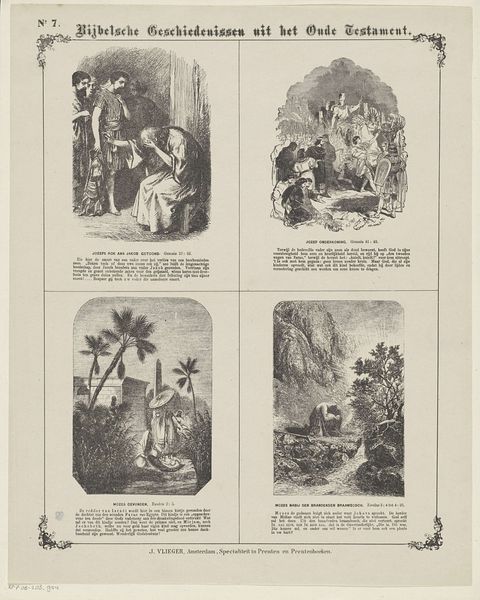 Curator: Here we have “Bibelsche geschiedenissen uit het Nieuwe Testament,” or "Biblical Stories from the New Testament," a print created between 1871 and 1908 by W. Cheshire. It appears to be a series of engravings, neatly arranged on a single sheet. Editor: My first impression is that this work is a study in contrasts, between light and dark, figures in motion and stillness. It feels very Victorian, with a stark sensibility, even didactic. Curator: Indeed. Cheshire’s technical skill is apparent in the density of lines, particularly how the composition in each engraving conveys depth and form. Observe the variations in mark-making to create texture. The light seems almost directed, doesn't it? Editor: The compositions also speak to a particular moment in the history of printmaking, reflecting a desire for affordable art to reach wider audiences—functioning as both education and moral instruction. We might consider the socio-political contexts where mass-produced imagery gained importance. The narratives presented here, of course, would carry different resonance for viewers. Curator: The narrative sequencing draws me in. We move between various biblical scenes, from agricultural labour to darker moments of trial and betrayal. Semiotically, consider the weight of the palm tree appearing consistently as both an architectural detail and signifier of place. Editor: The figure groupings and how they engage with each vignette feel especially staged. It’s as if Cheshire is creating these as mini morality plays. The social codes evident through gesture and framing also deserve interrogation. What behavioral patterns are implied here and for whom? Curator: Agreed. Also, each image creates a satisfying figure-ground relationship that directs the eye within the entire arrangement, which is so balanced! Editor: It has given me much to consider regarding religion and cultural interpretation. The Victorian context significantly shapes these renderings. Curator: It's certainly made me reflect upon the craftsmanship of engraving and the power of tonal range. Thank you.