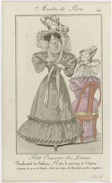 Editor: Here we have a print from 1827, titled "Petit Courrier des Dames," which roughly translates to "Little Ladies' Courier." It's an anonymous work showing two women in elaborate dresses. I find the image strangely subdued, even with all the ribbons and frills. What draws your eye when you look at this piece? Curator: Ah, subdued is an interesting word! It reminds me of pressed flowers. It *is* delicate, isn't it? Think of it as a whisper from a very particular moment in time. For me, it's the quiet elegance, almost a restrained theatricality. Consider the "peignoir d'organdi" - that organdy dressing gown. The fabric itself would have been sheer, almost ghostly. And then the bonnets! Frivolous mountains of lace and ribbon. But they're all rendered in such a muted palette. Does that contrast make sense? Editor: It does, actually. So it's not just about fashion, but also about presenting an ideal of womanhood. Is there a story being told, beyond the clothes themselves? Curator: Perhaps a story of aspiration. This would have been a fashion plate, circulated to those who could afford to dream of such garments. These women aren’t merely wearing clothes; they are embodying a certain societal position, performing an elevated role. Notice how poised they are, despite the frankly ludicrous headgear. Or maybe they *are* the ludicrous headgear! What do you think that tells us about our distance from their sensibilities? Editor: That's fascinating! I never thought about it that way. Seeing them as performers rather than just pretty pictures gives the image a whole new dimension. I initially thought this image felt distant, now I want to learn more about it. Curator: Exactly! And isn't that the thrill of it all? It speaks to us across time in layers, waiting to be revealed. These fashion plates invite us to dream about the world of early 19th century France, and wonder whether its whispers still resonate in our lives today.