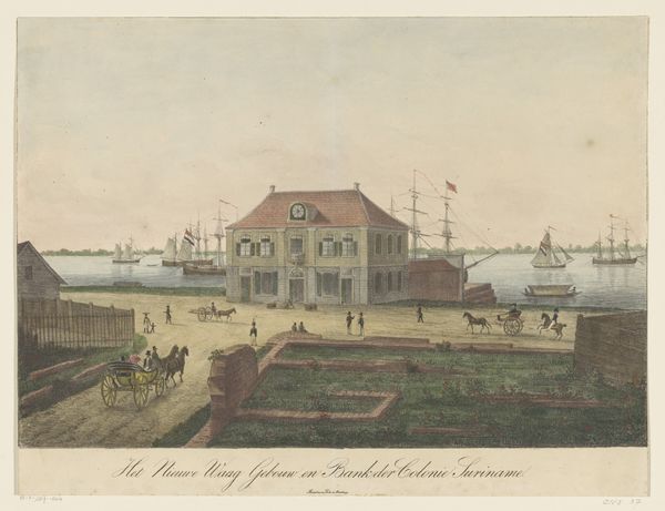 Leonardus Schweickhardt created this print of the Waterkant in Paramaribo, Suriname using etching and watercolor. These processes rely on the skilled application of ink, acid, and pigment to paper, each demanding precision and control. The linear quality of the etching defines the architectural and nautical forms. The subtle washes of watercolor then animate the scene, lending an atmospheric depth to the composition. The even, diffused light enhances the scene's seemingly calm appearance. The reality was different: the bustling port city was a hub for the trade of enslaved people and goods extracted through forced labor. The detailed rendering of ships, buildings, and figures invites viewers to contemplate the labor and trade. These elements were essential to the colonial economy Schweickhardt depicts. The combination of etching and watercolor in this print bridges the gap between technical drawing and artistic expression, inviting us to reflect on the complex social and economic forces at play in 19th-century Suriname.