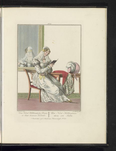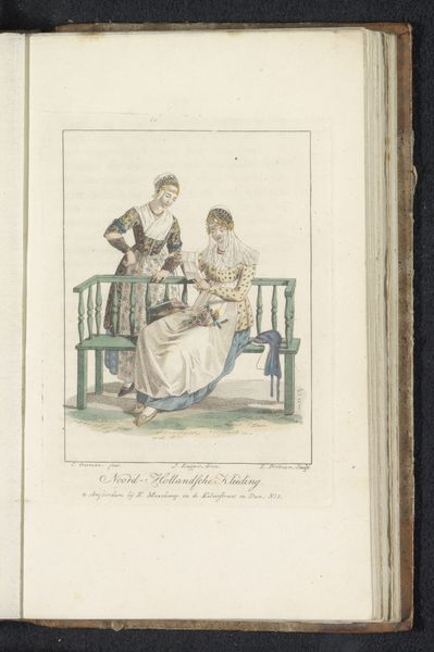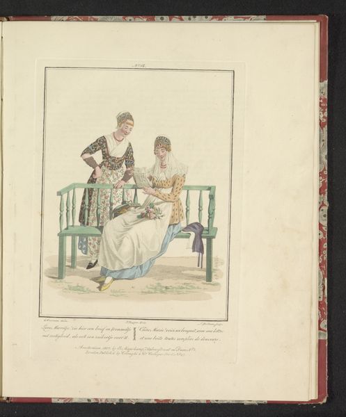 Editor: So, this drawing by Ludwig Gottlieb Portman, titled *Two Girls from North Holland*, made with watercolor on paper sometime between 1807 and 1829, feels like a quiet glimpse into another time. The detailed costumes are really striking. What stories do you think these clothes and the scene might be telling? Curator: Indeed! Look closely at how those meticulously rendered costumes place the wearers within a specific time and place, carrying visual cues about their identity and social standing. Consider, too, the subtle dynamics between the figures – one reading aloud, the other listening intently. What unspoken messages do you find within their interaction? Editor: Well, one girl's sitting down reading the letter, the other is standing next to the bench kind of leaning in, listening... perhaps they're friends sharing a personal moment? Maybe the letter holds exciting news? Curator: Perhaps. Now, consider what it meant to capture such scenes at that time. Genre paintings, like this, started to emerge depicting scenes from everyday life. Could it be an interest in recording the culture and costumes? What kind of value would everyday representation have held? Editor: Hmmm... Maybe it's about celebrating regional identity? This *is* specifically about girls from North Holland, so maybe showing the distinctive elements of their clothing and life was something new and interesting. Curator: Precisely! The clothing, setting, and interactions aren't merely decorative, but carry symbolic weight. They become a form of cultural preservation, fixing a moment in time andmemory through visual representation. Editor: It’s like a little piece of history, carefully documented. I guess art really can capture a lot more than just what’s on the surface. Curator: Exactly! The clothing is so fascinating - how it marks social class and how the relationship is equally captured within that scene. A fleeting moment turned into something with lasting impact, don’t you think?