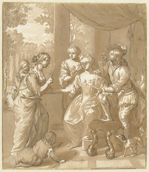 Curator: "De Opdracht in de tempel," or "The Presentation in the Temple," crafted around 1746 by Jacob de Wit, welcomes us. Look closely at the textured interplay of ink, watercolor, and charcoal on paper, all dancing in Baroque rhythm. What's your initial feeling as you stand before it? Editor: A hushed reverence falls over me. The earth tones, tinged with delicate blues and reds, give a sensation of witnessing a sacred, age-old ritual in the heart of a temple. But why the soft colors and loose lines? Almost like it's fading. Curator: I think the softness stems from de Wit's intuitive process and the media. He uses a sort of fluid draftsmanship. Consider how he masterfully employs these fluid mediums to capture not just the physical setting, but the tender emotional undercurrents. Look at how the light pools, creating focal points that emphasize key figures. It is as if he wants us to feel as though the picture itself might simply dissolve. Editor: True, and I notice how the composition guides our gaze. We are immediately drawn to the central figures, Mary and the baby Jesus, surrounded by witnesses on these softly drawn steps. Curator: Precisely! De Wit wants you to take this spiritual moment and be moved not only through intellectual interpretation, but also on an emotive level. How does this "history painting" blend the celestial with the everyday? Editor: Ah, yes—history brought alive through the lens of emotion. The subtle upward gaze of certain figures elevates the narrative, and contrasts beautifully with the grounded, almost tactile textures of the materials themselves: charcoal dust turned holy. So he blends an appreciation for surface quality with Baroque sensibility? It sounds amazing, and reminds me, in an oblique way, of Umberto Eco and semiotics. It looks like the painter might be trying to talk to us through gesture. Curator: Exactly. We feel that push and pull of artistic license, and also his religious conviction. De Wit presents a masterclass in navigating visual language to amplify meaning and elicit visceral reactions. Thank you, it looks as if both we as an audience are witness to this miracle, as we attempt to bring the temple down from above. Editor: Agreed. A moving composition that invites a modern appreciation of surface quality and human story alike.