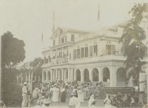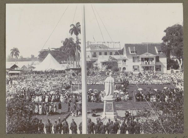 Editor: This photograph, titled "Volksspelen op Koninginnedag op het Gouvernementsplein," by Eugen Klein, likely taken sometime between 1905 and 1931, captures what appears to be a Queen's Day celebration. I am immediately struck by the image's texture and density; the sheer number of people creates a visual buzz. What strikes you most about this piece? Curator: The production of this photograph, particularly in this era, requires us to consider the laborious process involved in creating even a single image. From the preparation of the photographic plate to the careful development, it represents a significant investment of time and resources. How might the constraints of photographic technology at that time have shaped the artist's choices in capturing a scene like this? The pictorialist style also sought to elevate photography to the level of fine art. This could be interpreted as an attempt to document a celebration for a Dutch Queen, but what are the social contexts or commentary of capturing what is essentially a staged or arranged landscape of local inhabitants and government administration? Editor: That’s fascinating. It does seem that arranging such a dense scene would have been a considerable undertaking, given the limitations of the medium at the time. Perhaps there's an implied relationship of power here, in who gets to participate and who’s being presented, and why they have to "play" their parts on camera, using social currency as production material, just like with the use of platinum or other light sensitive compounds? Curator: Precisely. And it's worth considering, then, how photography itself was being consumed during that period, right? Beyond individual prints, it served a crucial role in shaping the idea of national identity and projecting a particular image of the nation to the world. Understanding these images as products of both technological and social processes provides a valuable insight into the broader socio-political landscape. We can then begin to read "Volksspelen op Koninginnedag" through these frameworks to appreciate its function and role beyond aesthetic values. Editor: Thank you, it completely reframes my understanding of the photograph's purpose, as more of a manufactured moment, designed and developed, quite literally, through materials and production for societal consumption. Curator: And understanding that material relationship adds so much depth to what we’re seeing and how these images circulated then, compared to the ephemerality of image culture today.