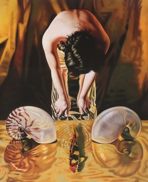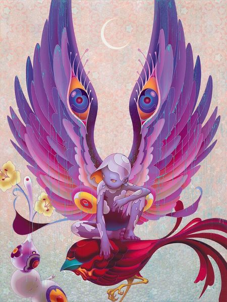Editor: Here we have Boris Vallejo’s “Spring Garden,” created in 1981. It’s a striking acrylic painting. I’m immediately drawn to the fantastical nature of the piece, the blend of human and butterfly form. What do you see in this piece, especially in the context of its symbolism? Curator: This work vibrates with layered symbolism, a visual echo of myths and archetypes. Note how Vallejo melds the figure with the butterfly—an age-old emblem of metamorphosis and rebirth, right? The butterfly wings painted with what seems like water color or an aurora perhaps symbolize not only transformation but freedom and beauty but the way they're contrasted in both hue and size points to deeper considerations about the limits or power within that transformation. What do you make of the female form? Editor: Well, it certainly speaks to an idealized beauty, very classical, but the wings suggest something more ethereal and otherworldly. Do you think there's an intended connection between her form and the idea of nature, especially given the title "Spring Garden?" Curator: Precisely. The nude figure here invites the audience to embrace that primal, innocent sensuality we tend to associate with unspoiled nature and even an unvarnished freedom, if we let it. The red vegetation near her mouth, perhaps some psychedelic growth, evokes fertility and growth. How does it feel separate from our culture? The contrast emphasizes a tension between earthly desire and spiritual aspiration— a yearning woven deep into the collective human psyche. Editor: That’s interesting, I hadn’t considered it from a cultural memory standpoint, or of something lost to modernity. This piece, on the surface, feels almost escapist. Curator: Indeed. What is that impulse of escapism though? Perhaps that escapism is more of an awakening to possibilities or an awareness of an unacknowledged collective longing we see coded in fantasy for liberation of self and our experience on earth. It provides, and provokes, cultural memory for other futures and different selves that we deeply desire and crave as a culture and individuals within it. Editor: That reframing is extremely helpful; I see this painting with entirely fresh eyes.