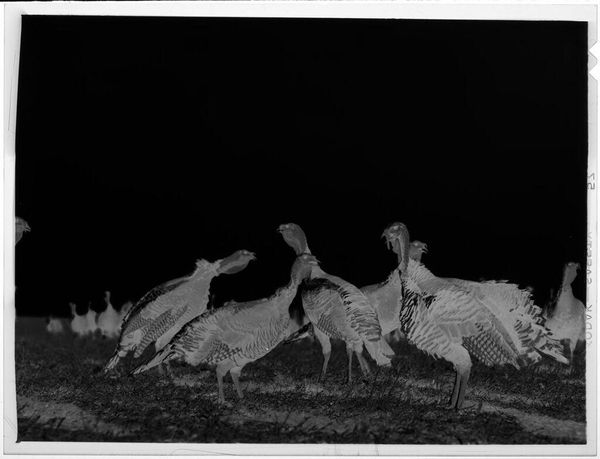 Editor: This photograph by Harry Annas shows two men kneeling amongst a flock of turkeys. It has a stark, almost haunting quality to it. What historical context might inform our understanding of this image? Curator: The photograph provides an interesting look into the realities of agricultural labor, particularly concerning animal husbandry. How were these workers and animals represented, and what socio-economic narratives were crafted? Editor: So it's about understanding who controls the image and the implications for the people depicted? Curator: Precisely! This photographer's choices matter, as well as the institutions that display it, in shaping public perception of rural life. Editor: That’s a powerful perspective. I hadn't considered the role of institutions in shaping this narrative. Curator: Exactly. This image offers many layers to unpack about the politics of representation.