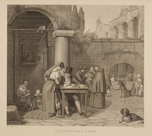 This engraving called "Gezin in gebed" was created by Carel Frederik Curtenius Bentinck. The somber grey tones and rigid architectural lines immediately evoke a sense of solemnity. Observe how Bentinck uses the structure of the church interior—the arches, columns, and statues—to frame and almost contain the praying family. This deliberate composition suggests a world that's ordered and hierarchical, reinforcing societal expectations of family piety within a religious context. The stark contrast between the cold, unyielding stone and the soft, rounded figures of the family creates a visual tension. Consider how this tension might reflect broader philosophical concerns of the time. Is Bentinck subtly critiquing the rigidity of religious institutions? Is he perhaps highlighting the vulnerability of individuals within these structures? The unanswered questions are what makes art a continuing source of discourse.