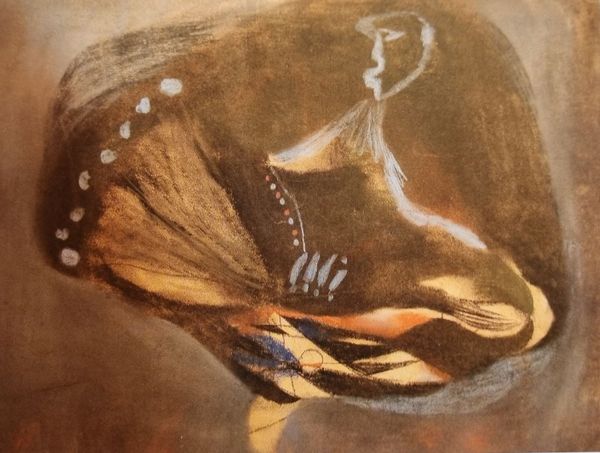 Curator: Here we have Oleg Holosiy's 1988 oil painting, "Pathetic Angeliada." What's grabbing your attention right away? Editor: It’s somber, almost mournful. The darkness is punctuated by those stark white… are they wings? It feels weighty, both visually and emotionally. I imagine this wasn’t a light undertaking physically, given the apparent layers. Curator: Holosiy's from Ukraine; this was painted in the late Soviet period. These darker palettes are so common. Oil paint offered a cheap way for artists to create depth with a complex layering process when materials may not have been easy to get. Editor: Ah, the layers – I can definitely see the depth in them now, imagining the labour that went into its construction. And that limited material access absolutely speaks volumes, impacting not just what could be created but how. Curator: Exactly. It prompts us to ask questions. What did this "Angeliada"—this angelic scene, represent to Holosiy and to those who saw it then? Those stark wings you noted are reminiscent of forms reaching up through an abyss of grey. Editor: Right, the wings. I initially read them as reaching, maybe pleading. But set against that turbulent background, they become less about hope and more like echoes, faint traces of a vanished belief system perhaps? Curator: It is equally an image made in its moment—one might look into his particular background to look into the Soviet symbols of suffering and salvation, of course. Editor: Yes, Holosiy has interwoven his own symbolic interpretation on top of collective ones—it reflects anxieties of identity during late Soviet era. Knowing more about its social framework does deepen my engagement, it changes what was sorrowful, almost. Curator: In many ways, an echo in oil—or an "echo in paint," perhaps. This close look really gives it another angle of insight for me. Editor: For me as well—and it underlines that materials always talk, it shapes culture, it shows us how symbols morph.