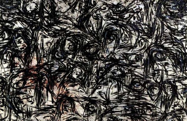Editor: Here we have Nicolas Carone's "Hyperbola," an oil painting from 1954. It's a whirlwind of black and white with some hints of red, all swirling together. Honestly, it feels chaotic and energetic to me. What do you see in this piece? Curator: Immediately, I recognize the language of Abstract Expressionism. But beyond the surface, there’s a visual dialogue at play here, echoing ancient mythologies. Notice how the contrasting blacks and whites vie for dominance. Does this visual tension evoke any symbolic struggle for you? Editor: I see the tension, yes, but struggle… I’m not so sure. It feels more like a dance to me, albeit a frenzied one. Curator: A dance! I love that. Consider the era, though. The post-war anxiety was palpable. Artists were grappling with expressing trauma and the fragility of human existence. Could this frantic dance also be interpreted as a symbolic struggle against chaos, against meaninglessness? Look at how the pale reddish central element anchors all that frenzy: does it resemble a distorted representation of a human form? Editor: I can see a figure now that you mention it! Maybe that touch of color offers some hope amid all the turmoil? Curator: Precisely! The use of abstract forms allows Carone to tap into primal emotions, universal experiences. What personal associations come up for you? Editor: It reminds me of a bustling city, full of fragmented stories and fleeting encounters. It's overwhelming, but also alive. Curator: Beautifully put! The city, a microcosm of humanity’s complexities. Editor: I never would have considered all those symbolic layers. I’ll definitely look at Abstract Expressionism differently now! Curator: That’s the power of art, isn't it? To open up new avenues of seeing and feeling, linking our personal experiences to broader cultural narratives.