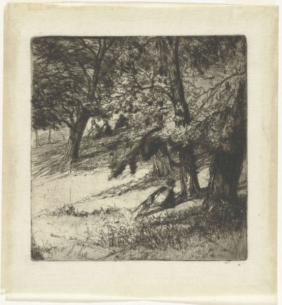 This print, “Tuin met grote boom” (Garden with large tree), now in the Rijksmuseum, was made by Carel Adolph Lion Cachet using the technique of etching. An etching begins with a metal plate, often copper, coated with a waxy ground. The artist draws through this ground with a sharp needle, exposing the metal. The plate is then immersed in acid, which bites into the exposed lines, creating grooves. Ink is applied to the plate, filling these grooves, and the surface is wiped clean. Finally, the plate is pressed onto paper, transferring the ink and creating the print. Look closely, and you'll see the effect of this process: the fine, slightly irregular lines that give the image its texture and depth. In particular, consider how labor intensive this technique is compared to quick drawing practices. Cachet would have spent hours creating the metal plate, which would have been a painstaking process. It is the labor, and the unique qualities of the etched line, which give this work its distinct character. We often think of printmaking as a relatively mechanical process, but this work reminds us of the artist’s touch and his own engagement with the material.