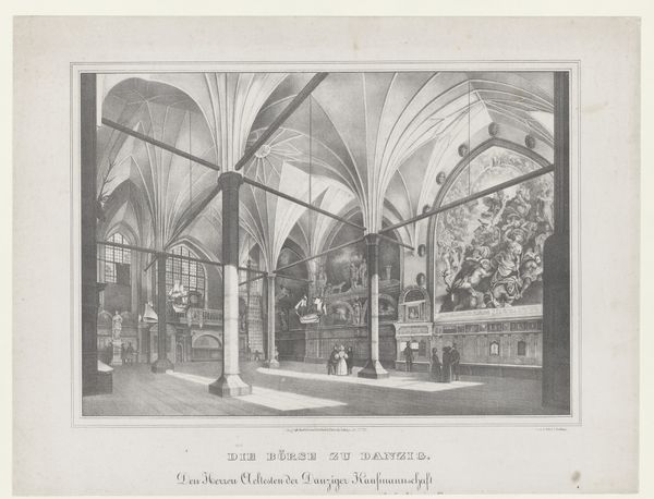 Hendrik Hermanus Vetter made this artwork, "Interior of the Sint-Janskerk in Gouda," using graphite and brush on paper. During the early 19th century, artists like Vetter were navigating a shifting landscape, where the rise of nationalism intersected with artistic expression. Vetter's choice to depict the interior of St. Janskerk is interesting; rather than focusing on the grand narratives of the church, the artwork offers a subdued, intimate perspective, inviting viewers to reflect on the intersection of faith, community, and individual experience. The figures in the foreground, rendered with a gentle touch, suggest a human scale within the vastness of the church. It’s as though Vetter is acknowledging the quiet moments of contemplation and connection that take place within the confines of religious institutions. The artwork prompts us to consider how spaces shape our identities.