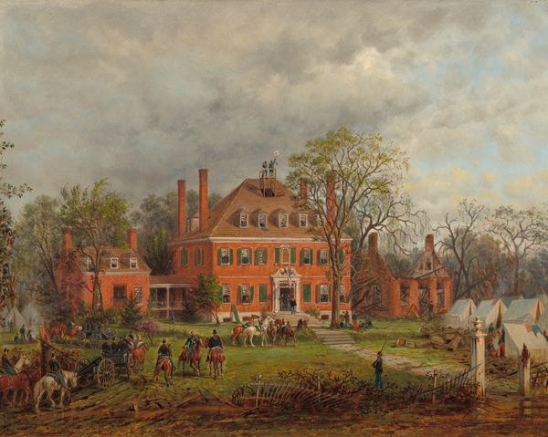 This painting, "New England Country Seat," date unknown, by an anonymous artist, presents a meticulously ordered landscape. The composition is arranged symmetrically, creating a sense of balance and idealized harmony. The mansion, set back, is the focal point, flanked by trees and outbuildings. This geometrical precision evokes a controlled vision of nature. The artist’s style is characterized by flat planes of color, especially in the sky, which mutes atmospheric perspective. Linear elements define architectural details, giving the buildings a geometrical clarity. This calculated approach to form reflects a desire to organize and control the environment depicted. The painting functions as a semiotic system. The orderly composition and detailed rendering of architectural features express power, prosperity, and order. By employing flat colors and a lack of atmospheric depth, the artist creates a tension between representation and abstraction. This tension reminds us that visual forms are not merely reflections of reality but constructions that carry cultural and ideological meaning.