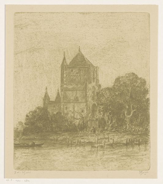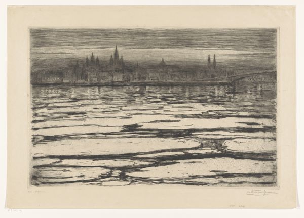Curator: Looking at this evocative cityscape, "Gezicht op Keulen bij avond," or "View of Cologne at Evening," etched by Carel Nicolaas Storm van 's-Gravesande around 1896, you immediately get a sense of time and place. Editor: My first impression is one of atmospheric depth. The tones create an ethereal almost dream-like image. The composition feels traditional, perhaps even a bit romantic, but the dark palette subverts that somewhat. Curator: Van 's-Gravesande, a key figure bridging the Hague School and Impressionism in the Netherlands, captures more than just the buildings of Cologne. As an etching, it showcases a printmaking process demanding meticulous labor. How do you think his choice of such a demanding method contributes to the finished piece? Editor: The hatching and cross-hatching generate a phenomenal range of light and shadow which becomes an essential component. Its tonal qualities evoke something between a mezzotint and aquatint, allowing areas of soft gradations which gives that atmospheric touch I mentioned earlier. The composition is simple yet strong, built up on horizontal bands of river, city, sky... Curator: And if we consider the materials readily available at the time, etching allowed for replicability and wider distribution, meaning this view of Cologne could reach a broader audience than a unique painting. Editor: True, but from a formal standpoint, look at how the spires of the Cologne Cathedral dominate the composition, a triad against a muted skyline, reflected faintly on the still waters of the Rhine. Notice how all visual information is reduced to tonal relation and gradations in a relatively low range. Curator: Perhaps van 's-Gravesande used the etching to comment on the industrialization happening in urban centers at that time, through its reproducible format and his almost impressionistic style; he provides what feels to me to be like an urban document of change during the late nineteenth century. The factories supporting this industrial process would depend on access to trade. I wonder, did he spend long hours simply gazing, trying to reflect the essence of what it was to be there as a form of labor itself? Editor: A valid proposition to ponder; nevertheless, beyond socio-economic perspectives, this image, viewed solely within its aesthetic qualities, demonstrates a masterful study in light and tonal harmony, especially as captured within a specific time of day. It truly provides much to see. Curator: Precisely! Considering the socio-historical context along with the artist's craftsmanship deepens our understanding of it; an everyday scene turned evocative by its material means. Editor: Indeed. Considering solely the composition opens the mind and reveals a deep aesthetic value.