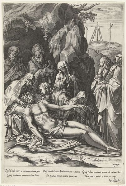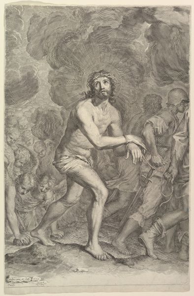 Editor: Manet's etching, Dead Christ with Angels, presents a really striking image. It feels both classical and strikingly modern. What do you see in this piece beyond the obvious religious symbolism? Curator: Manet, working in a time of social upheaval, uses religious iconography to question power structures. The dead Christ, surrounded by angels, isn't just a symbol of sacrifice, but also a challenge to established authority. Consider how Manet’s Christ is not idealized; the stark realism speaks to the suffering of the marginalized. Editor: So, it’s a commentary on social injustice masked as a religious scene? Curator: Precisely. Manet situates the biblical narrative within the context of 19th-century France, prompting us to reflect on who holds power and at what cost. It’s a potent visual critique. Editor: I hadn't considered that. I see it in a completely different light now.