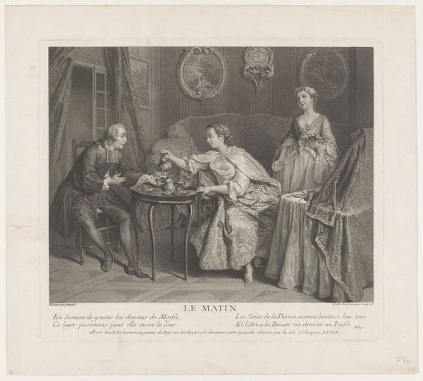 Editor: This engraving from 1815, titled "Oldtid - nutid no. 1," is by Gerhard Ludvig Lahde. It's split into two scenes, which reminds me of a diptych. The composition on each side has a very distinct atmosphere; one seems very traditional, the other more modern. What do you see when you look at this piece? Curator: I observe the formal construction, how Lahde bifurcates the visual field to generate a dialectic. The interplay of light and shadow distinguishes each half, creating a dichotomy. Notice how the linework in the “Oldtid” segment is more deliberate, constrained, while in “Nutid,” it is softer, more fluid. The figures’ gazes—downcast versus self-absorbed—contribute to the overall thematic contrast. Do you agree? Editor: Absolutely. The differing levels of detail definitely accentuate the themes of "old" versus "new." I see the detail in the spinning wheel, balanced with the modern woman’s reflection in her mirror. Why do you think the artist chose engraving for this piece? Curator: The selection of engraving as a medium invites consideration of its inherent qualities. Engraving, with its capacity for precision and fine detail, echoes the era's transition. The crispness suits the historical reflection. Think about how printmaking facilitates broader distribution; is Lahde inviting a societal commentary on accessibility and visibility through this technique? Editor: That's interesting. So the choice of medium is not only aesthetic but adds layers of meaning? I will definitely consider that perspective from now on. Thank you! Curator: Indeed. The synthesis of form and content, when closely analyzed, provides valuable insights.