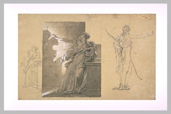 Curator: Nicolai Abildgaard created this drawing, whose full title is rather a mouthful: "Frontongruppe med talrige figurer, der bringer frugter og varer hen mod et alter, ved hvis side der står en kvinde, symboliserende skibsfarten.” He made it sometime between 1743 and 1809. Editor: Oh, that's… wonderfully exhausting just to say. My first thought: it feels very architectural. It's all angles and muted tones. I'm getting a sense of historical weight, but it also feels like a blueprint. Curator: Indeed! The drawing displays a bustling scene—figures hauling goods towards an altar, flanking a woman symbolizing seafaring, all sketched with pen and ink. What resonates with me is the dynamic tension. Abildgaard captures this flurry of activity and, simultaneously, imbues the composition with a kind of serene, neoclassical order. The light pencil work almost dances across the toned paper. Editor: Yes, there is an undeniably classical feel, doesn't there? Makes me think about trade and exchange, not just of goods, but ideas, and how often that movement rests upon exploited labor and gendered symbolism. That central figure, the woman... the way she’s passively watching this exchange makes you wonder what position and power she holds, really. Is she truly the symbol of a prosperous seafaring industry, or is she just the emblem of male capitalist endeavors? Curator: That's a powerful reading! For me, it brings to mind the grand narratives that underpin nation-building – Abildgaard’s work often deals with themes of history and mythology in the context of his time. His drawings, particularly, carry a sense of intimacy, allowing us a glimpse into his thought processes. I find it inspiring, like eavesdropping on a great mind at work. Editor: Absolutely! Recognizing the embedded historical layers lets us pose crucial questions about art's social role in shaping such cultural understandings and systems of power. The past never really dies, does it? Curator: It certainly keeps us on our toes! Thank you, this artwork keeps whispering and asking to find different answers. Editor: Precisely, and I hope our reflections spark conversations and reveal the multi-layered, nuanced readings that these sketches prompt us to make.