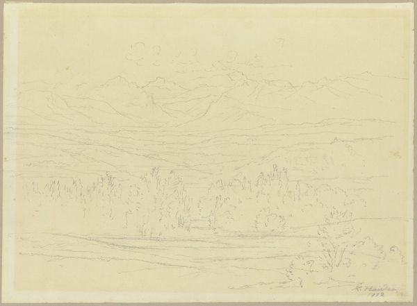 Editor: So, here we have Jervis McEntee's "Mist on the Mountains," a graphite drawing, most likely on paper. It's an undated work, but it feels so delicate and tranquil, a real testament to close observation. How do you interpret this work from a formalist perspective? Curator: A keen question. First, consider the interplay of line and tone. McEntee masterfully uses graphite to create varying degrees of density, implying spatial recession and atmospheric depth. Note how the mountains, though the largest form, are rendered with a lighter touch compared to the trees in the middle ground, shifting the supposed depth of field. Editor: That's interesting. It does flatten the picture plane in a way, drawing the eye back and forth. Curator: Precisely. And the composition is far from symmetrical. The careful distribution of forms—the placement of the trees, the subtle curve of the path—creates a visual rhythm. Could this suggest an implicit visual equation of near, medium, and far in equal parts? Editor: So, you're saying the balance is not merely aesthetic, but perhaps conceptually driven as well? Curator: Potentially. Now, observe the texture achieved purely through graphite. The short, broken lines that constitute the foliage versus the smoother, more blended strokes used for the mountains; how might we read these signifiers? What do these distinctions highlight in the represented subject? Editor: I see. The change in texture emphasizes the difference in the materiality of the mountains versus the more tangible sense of detail and volume from the tress. It's a very considered composition. Curator: Indeed. Reflect on how McEntee’s restrained use of medium allows him to evoke a powerful sense of atmosphere, challenging the viewer to appreciate the intrinsic qualities of the materials themselves, as much as the depicted landscape. Editor: It highlights that the magic is as much in *how* it’s drawn, as in *what* is drawn. Thanks!