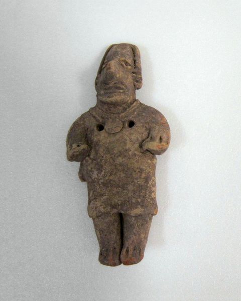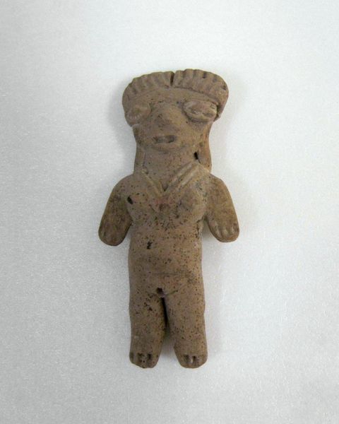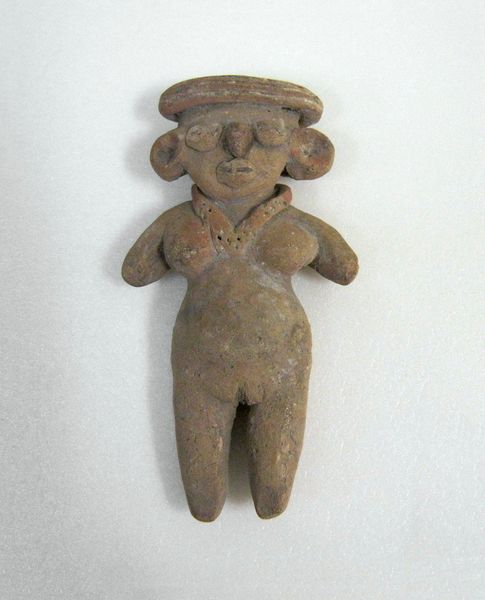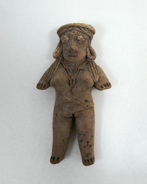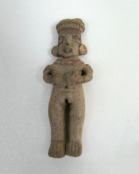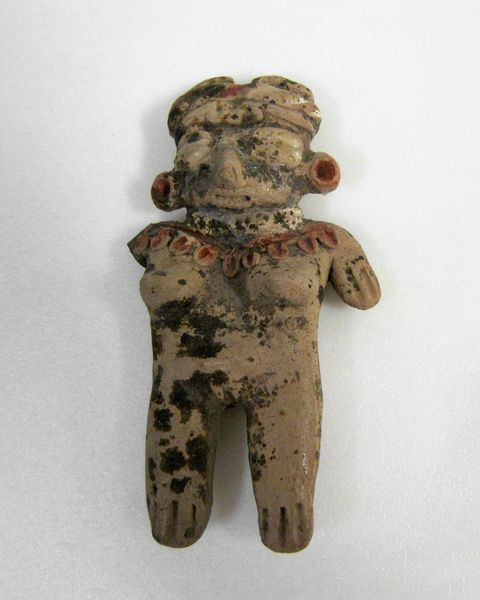 This standing female figure was made by the Chupícuaro people in ancient Mesoamerica from reddish-brown clay. The sculpture’s appearance is significantly influenced by its material, the clay, which gives it a warm, earthy tone, and a slightly coarse texture. You can see it was likely formed by hand, perhaps with simple tools to define the features. The large ear spools and headdress tell us that this figure likely represents a person of high status. The process of creating this figure would have involved gathering and preparing the clay, carefully shaping it, and then firing it in a kiln to harden it. These figurines were often made for burial offerings, reflecting a significant investment of labor and cultural meaning. Looking at this figure, we can appreciate the deep connection between materials, making, and the social context of the Chupícuaro culture, challenging our modern distinctions between art and craft.