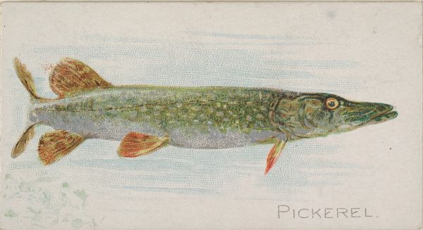 Curator: This lithograph from 1888 by Knapp & Company is titled "Pickerel, from the series Fishers and Fish (N74) for Duke brand cigarettes." It gives us an interesting peek into the marketing of the time. Editor: Immediately, I see the pickerel rendered with delicate watercolor. Its posture seems almost celebratory against the background which looks almost like parchment. There's a sense of understated elegance here. Curator: It is striking, especially when considering its original purpose. These cards were included in cigarette packs as collectibles, designed to build brand loyalty with appealing imagery. The fish are highly detailed and accurately rendered; an element likely considered very seriously by the client, Duke. Editor: Absolutely, beyond commercial applications. Fish have long held a rich symbolic charge, representing fertility, abundance, and even spiritual transformation across many cultures. But here, within this rectangular border and advertisement context, it takes on this new dimension of collectability and luxury associated with a very specific, booming brand. Curator: Exactly, it’s the transformation of a natural object into a commodity, imbued with aspirational qualities by its association with the Duke name. We also need to acknowledge that mass-produced imagery also helped shape ideas of nature and leisure, circulating particular versions and priorities within the population at large. Editor: And I imagine the very act of collecting these cards instilled a certain ethos. An engagement in popular cultural history that blends science and aesthetics as related forms. Each image adding up to some greater portrait of societal desires and aspirations. Even if those desires are packaged with tobacco. Curator: The scale of the image is itself important to consider in regards to its original distribution model, so being on display at the Metropolitan Museum allows an access that wasn’t otherwise available to some segments of the public. It opens access, prompting reflections of how nature has been and continues to be perceived and promoted. Editor: Indeed. I find myself looking at it now and imagining its impact on folks a century and a half ago. To me, that blending of nature and marketing tells quite a story about both our cultural values, our place in the natural order and its continuing echoes today.