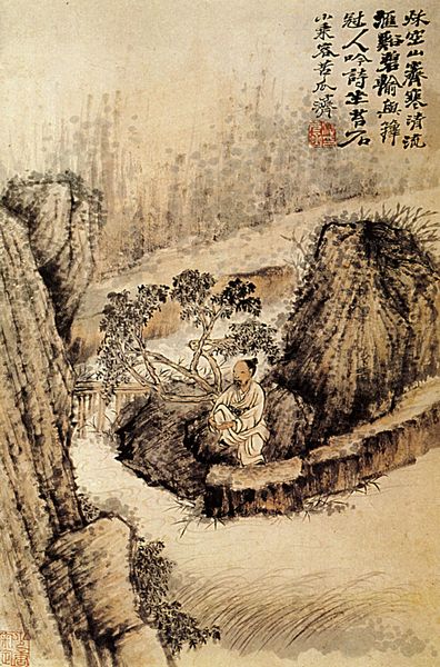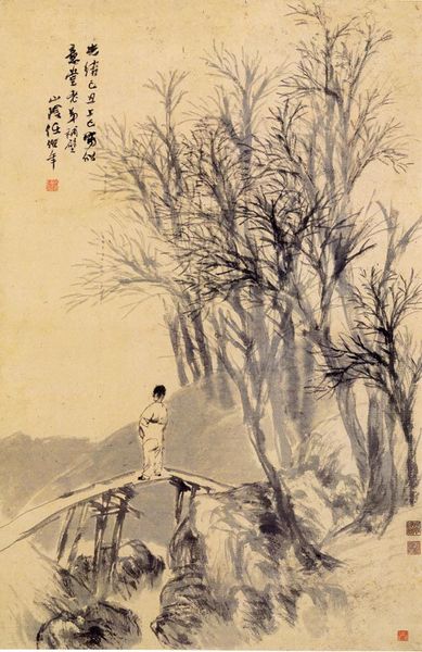 Curator: Shitao's mixed-media landscape, created around 1694, invites us into a world of layered meanings and suggestive forms, appropriately named "On the other side of the water." Editor: Well, right off the bat, I get a sense of longing and stillness. It feels like peering into a memory, something hazy but deeply felt. Curator: The ink, a key element, is masterfully controlled to suggest depth, blurring near and far. The blank spaces on the paper are just as vital as the ink-filled areas. It's about what isn't said, right? The artist suggests that it's what completes the picture. Editor: I completely agree; those blank areas aren't absences—they're invitations for my imagination to fill in the gaps. I see this little figure at the bottom... seems lonely in such a grand setting. Curator: Shitao uses the imagery of a lone wanderer, the embodiment of the artist in society. It can represent the solitude of the creative genius but also their harmonious relationship with nature. And look closely at the rendering of the water: lines vibrate and give texture, guiding the eye towards a sense of place—yet not. It's always on the other side of that ungraspable divide. Editor: The tall trees almost look like a barrier... very intriguing, indeed. Curator: And if you observe how the mountainside almost organically rises above the clouds, you may experience its dreamlike flow... and appreciate how mixed media is incorporated through his skillful, nuanced use of materials and diverse application techniques, giving depth and form. Editor: Makes me ponder my place in the world... feels expansive, this small window. Curator: Yes, even from across the centuries. And in these brushstrokes, in every blot and gradient, we perceive how the artist achieved, through skillful integration of brush strokes and water, how that space speaks to the soul. Editor: Well said. I will consider Shitao's message and move on now a little more centered. Thank you for opening this painting for me!