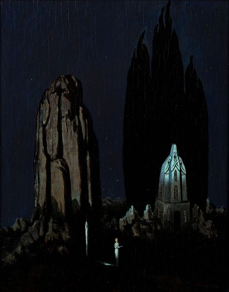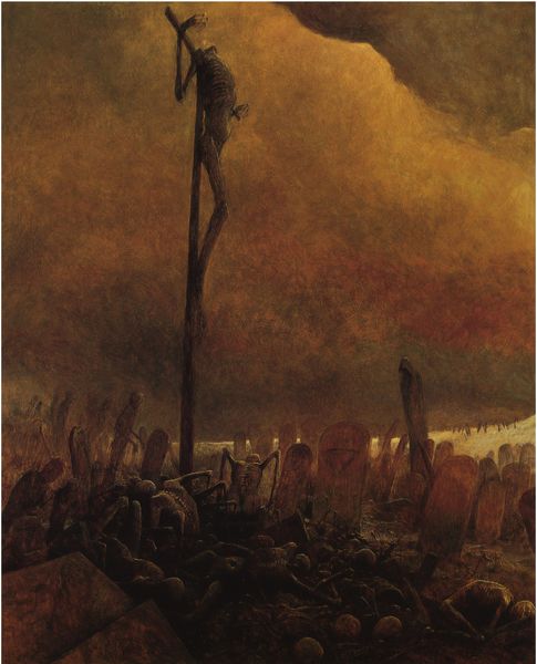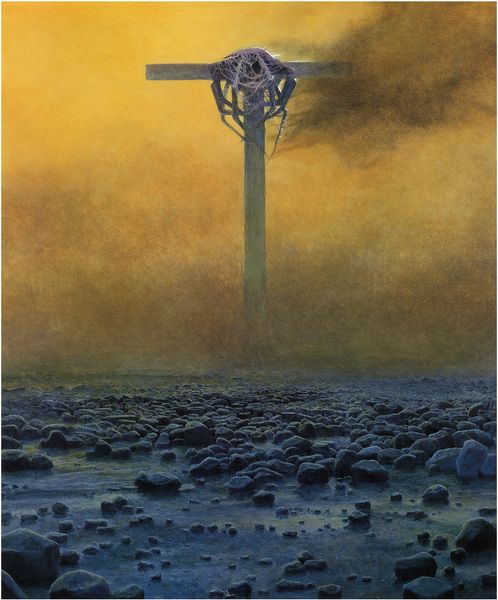 Editor: Standing here, taking in Caspar David Friedrich's "Cross and Cathedral in the Mountains" from 1812, painted with oils, I’m immediately struck by a feeling of…isolation. It’s a landscape, but the cathedral feels almost oppressive, looming in the distance. What's your take? Curator: Isolation, yes! A deep and potent loneliness permeates the work. It's almost as if Friedrich is placing us, the viewers, within his own intensely personal landscape of faith and doubt. Do you notice how the stark cross in the foreground, seemingly vulnerable amidst these imposing elements, is mirroring the towering gothic cathedral in the background? Editor: That mirroring is interesting. It feels almost contradictory though, doesn’t it? The cross feels so...fragile, against the grandeur of the church. Curator: Exactly! And that friction, that tension is where the real emotional weight of the painting resides. It’s as though Friedrich is asking us where we find true solace, in the simplicity of faith or the complex architecture of institutions. Or, perhaps, within ourselves as we grapple with these imposing dualities in nature. I like to think he captured not just the scene but his own soul-searching journey. What landscape resides within you as you look upon this scene? Editor: I get that. It definitely feels like he's less concerned with accurately depicting a mountain scene, and more with...externalizing an inner turmoil. Makes me rethink Romanticism! Curator: It's a delicious thought to consider Friedrich ripping open a seam in time with each brushstroke. Almost a landscape within a landscape! Thank you, the Romantic path has been opened even further for me today.