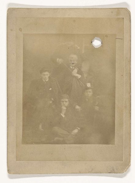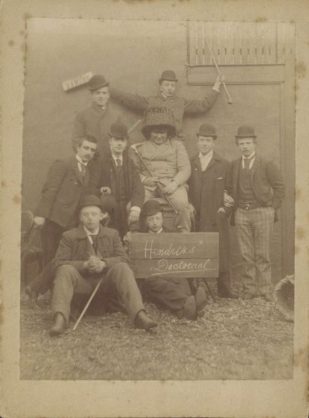 Curator: I’m immediately drawn to the tonal range. It’s quite narrow, lending a kind of antique uniformity to the scene. A monochromatic harmony, you could say. Editor: This is a gelatin silver print from 1887, titled "Groepsportret van tien studenten," or "Group Portrait of Ten Students," by Israël David Kiek. The photo gives us an interesting glimpse into student life during that period. You can almost imagine the cultural backdrop. Curator: Culturally, one can speculate about academic masculinity in the late 19th century. The arrangement is wonderfully asymmetrical, chaotic, and organic for a group portrait, while the subjects themselves, their attire and expressions, provide an intimate window into an established class of young men. The way they're posed hints at individuality, at playfulness. Editor: Indeed, portrait photography then wasn't just about capturing an image. It played a crucial role in identity formation and social representation. Commissioning a photograph was a statement about social standing and self-perception. This particular image strays slightly, maybe offering a more informal take on the academic environment, judging by the body language. Curator: Observe how the students use their walking sticks almost as extensions of themselves. Notice too, that the backdrop is rather indistinct, allowing the focus to remain keenly on the relationships between the sitters themselves. The contrast serves to unite the ten in one shared space. Editor: It's fascinating to see how Kiek’s work reflects the rising popularity of photography among the middle class and its role in documenting social change. This is academic art, sure, but there is something rebellious simmering here. Curator: It feels remarkably unguarded, which suggests a level of comfort and camaraderie among the group and perhaps even with the photographer himself. The overall impression suggests shared experience and social ease. Editor: Precisely. It enriches our understanding of how social bonds were formed and presented during that era. Now, considering how different photography has become since then, this image still feels so compelling. Curator: I agree. There is a sense of immediacy, despite its age.
