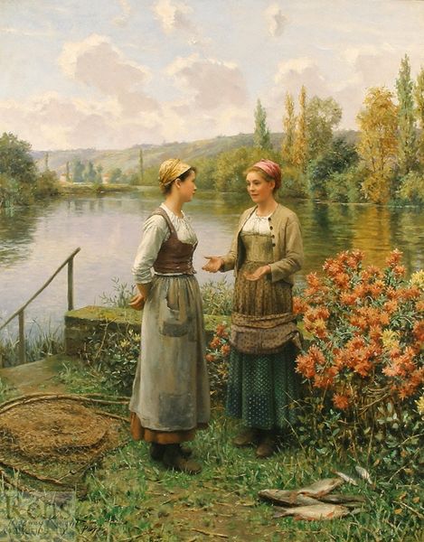 Curator: This is Daniel Ridgway Knight's "Girl by a Stream, Flanders," painted around 1890. It exemplifies plein-air painting, capturing an intimate view of rural life with oil on canvas. Editor: It’s peaceful, almost melancholic. The muted greens and browns create a very grounded feeling. She seems thoughtful, her gaze directed downwards and away, and almost trapped in this bucolic scenery, maybe even constrained by the very pastoral ideal it evokes. Curator: The figure’s relationship to the land is central to understanding Knight’s oeuvre. His artistic style bridges realism with romanticism, representing a return to the land and reflecting agrarian ideals present at the end of the 19th century. The woman looks exhausted from her labour. Editor: The symbolic weight of that sickle is powerful, but somewhat softened. It is at once a tool and a potential weapon; the labouring class have historically fought for better working and living conditions. However, I note the abundance of yellow wildflowers that create such a hopeful contrast. In different cultures and faiths, yellow symbolizes the divine or holy. The artist cleverly gives us two stories within a single moment. Curator: That’s a very insightful interpretation. I see it as Knight romanticizing a harsh reality; even if flowers surround the scene, that sickle hints at the hard labour and socioeconomic struggles of women within that time frame. The fact that her figure seems so trapped within the canvas enhances this analysis further. Her clothes are visibly old, despite them being intact. It reflects the culture of make-do-and-mend out of economic necessity at that time. Editor: Despite those potential allusions to harsh conditions, there is the undeniable serenity evoked by the soft brushwork on the verdant foliage and that body of water, offering her not only sustenance, but hope too. It really makes us think about the complexity of lived experience, particularly for women of that era. Curator: Indeed. Knight encapsulates that intersection between aesthetic beauty and socio-economic struggle masterfully. Editor: Absolutely. This piece remains incredibly poignant because of that complexity.