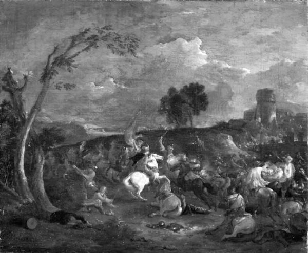 Curator: I’m immediately drawn into this swirling chaos. It feels like a glimpse into the underbelly of… well, civilization. All the noise, confusion, and the sense of figures propelled forward—almost against their will. Editor: Indeed. This canvas by Herman Doncker, painted around 1636, titled "Skirmish between Horsemen and Foot-Soldiers," captures just that. A raw, almost visceral snapshot of conflict frozen in time. It’s oil on canvas. The lack of color contributes to a starkness. Curator: A starkness, yes! Like a nightmare rendered in shades of gray. The horses, particularly, are these monumental symbols of power trampling… what? Hope? Innocence? Editor: Perhaps. Horses often signify power, dominance, but also, uncontrolled instinct. Notice how the central horseman raises his weapon. It echoes a classic pose of triumphant authority, but here, set against the backdrop of sheer panic, it reads almost as a futile gesture. It certainly invites you to consider how images are often propaganda tools. Curator: Futile is exactly the word. The entire scene is unbalanced, unresolved. Even the trees in the background seem to lean into the fray, adding to the overall sense of unease. Is that really an accurate portrayal of violence or something... deeper? Something universally haunting? Editor: Possibly both. Consider the psychology of war, the individual subsumed by the collective frenzy. The anonymous foot soldiers, faces obscured, are stripped of their individual identity. Are they heroes or victims? Hard to tell here. They reflect the artist’s nuanced exploration of conflict as both spectacle and psychological drama. The very absence of color amplifies this sense of a loss or void. It reminds us how conflict has always involved stripping people and the world around them from essential qualities of themselves. Curator: You've nudged me to think how Doncker must have perceived conflict, too. There’s an understanding—or maybe a fear—present that lingers with you even after you turn away from the artwork. Editor: Ultimately, the artist prompts reflection on the visual symbols and emotions around conflict. Curator: This image haunts but illuminates. It's a kind of uncomfortable poetry of human folly. Editor: Precisely. It compels us to question what resonates even now.