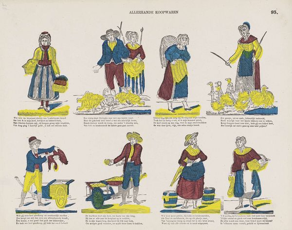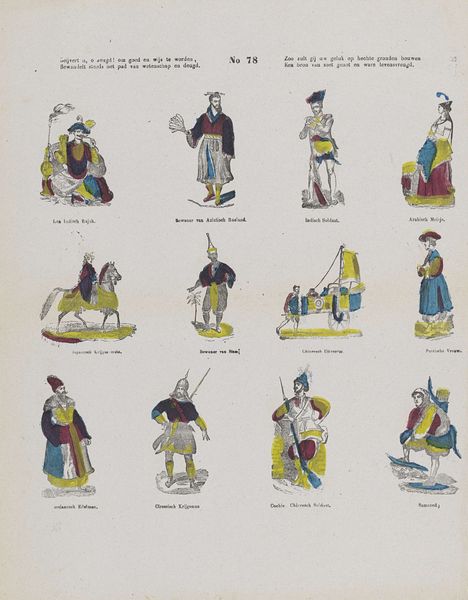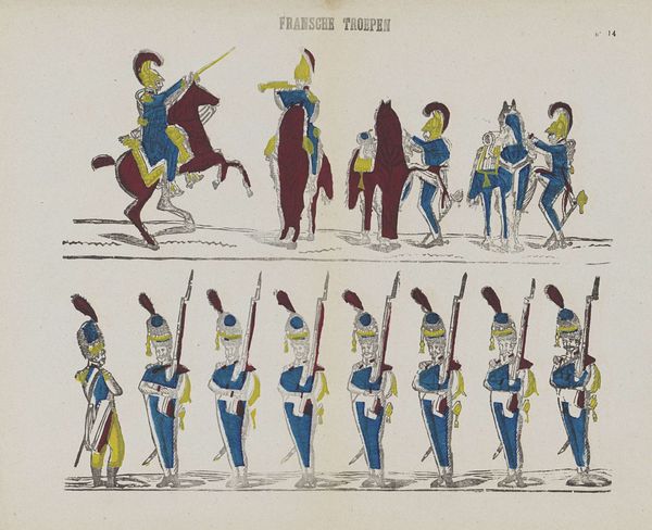 Editor: This lithograph from the Rijksmuseum, "Uniformes de gardes nationaux en France," created sometime between 1800 and 1833 by Philippus Jacobus Brepols, depicts various uniforms. There's something almost quaint about these figures standing so stiffly in their colorful outfits. How do you read this piece, knowing it was made during a time of significant political upheaval in France? Curator: I see these uniforms not just as fashion plates but as visual representations of power and the burgeoning sense of national identity in post-revolutionary France. They’re meant to project authority, but there's an element of performativity here. What stories do you think these uniforms are meant to tell? Editor: Well, obviously, it screams order and control, but there is also this fascinating sense of trying to solidify the identity of a nation after such a huge revolution. Curator: Precisely! These aren't just clothes; they're ideological costumes. Look at the specific details – the colours, the cut, the ornamentation. Consider what each of those elements might communicate about the wearer's role in the newly formed social order. How does this kind of imagery function to create or reinforce ideas about citizenship? Editor: So, the uniforms are more than just uniforms; they're statements about who belongs and what they represent within France's reshaping of national identity? Curator: Exactly! This print allows us to analyze the ways in which visual culture was being used to construct and disseminate particular notions of nationhood and civic duty during a pivotal moment in European history. I find it powerful that these prints helped shape and solidify societal expectations and the desired norms of gender and power. Editor: That adds so many layers of interpretation to what initially seemed like a simple depiction of uniforms. It's incredible how much historical and political context can be embedded within something like clothing! Curator: Indeed, and by questioning what these symbols meant at the time, we get a better understanding of how visual rhetoric functions in society, both then and now.