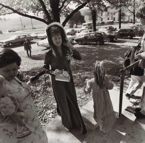 Curator: Larry Fink's gelatin-silver print, "Martins Creek Picnic, Pennsylvania" made in 1983 presents a compelling slice of American life. What are your first impressions? Editor: There's a sense of arrested motion. That child, caught mid-swing... it speaks to the transient nature of childhood itself. It’s nostalgic, but also unsettling, perhaps in the ways fleeting moments often are when they’re over. Curator: Absolutely. Fink’s work frequently addresses themes of class and social dynamics, often within the microcosm of seemingly mundane events like a picnic. This particular image, though, operates on a more personal level, doesn’t it? We see children at play. Where does the theme of social dynamics show up for you here? Editor: Look at the composition: The central figure is this fair-haired girl on the rope swing. Behind her and to the sides, you see a motley of other kids: A dark skinned child with his shirt off, the figure by the tree... all under Fink’s soft contrast that nonetheless illuminates them all. You get this feeling of neighborhood and all of what makes up a town’s younger set of faces, all different yet all bound by circumstance. Curator: It's true that Fink had the ability to freeze unscripted life. Thinkers like Pierre Bourdieu talked of "habitus", a set of dispositions we internalize. To me, the body language of those children reveals so much, particularly regarding learned behavior based on race, class and gender. Even the seemingly innocent setting doesn’t negate a deeper, sociological truth of lived inequality in places like small-town Pennsylvania. Editor: Inequality… sure. But Fink’s approach always had an inherent psychological dimension. In that snapshot of American youth, each gesture and gaze carry emotional weight. I'm drawn to that young girl gripping the rope, not simply as a figure trapped by Fink’s flash, but a signifier of our yearning to revisit or recapture past innocence and joy. Childhood holds such an idealized vision, doesn’t it? The artist’s genius lies, I believe, in his ability to use his work to ask just what it’d take to keep from falling…or what would happen if you just let go. Curator: True. It holds space for these simultaneous ideas. Perhaps the power here exists between documentation and dreamy emotional resonance, both pushing us to confront realities, but through vastly different lenses. Editor: An American memory, exposed. Curator: Precisely, it invites scrutiny, and personal reflection.