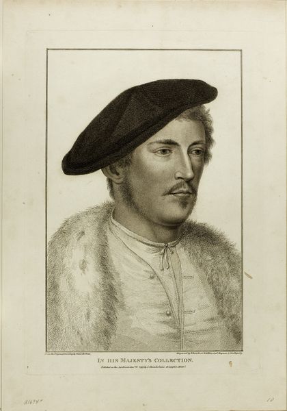 Curator: This portrait engraving from 1793, "Sir Thomas More, Lord Chancellor," created by Francesco Bartolozzi, offers a compelling glimpse into the representation of power. The print, rendered on paper, holds layers of social and political implications worth exploring. Editor: My immediate sense is one of subdued power. The subject's gaze is steady, but the monochrome palette mutes any potential drama. There's an air of contained energy, emphasized by the textures of fur and fabric. What do you see in the symbolism at play here? Curator: Well, it is hard to ignore that Sir Thomas More’s life became a focal point in religious and political power struggles. Considering Bartolozzi's time, we must acknowledge that depicting More would inherently engage with narratives of resistance against tyrannical authority, especially within a Catholic framework. Editor: Absolutely. The hat, the fur – they're not merely garments; they speak to More's status and role within a hierarchical system. Notice how Bartolozzi uses line work to differentiate textures—the soft fur contrasts with the crisper lines defining More’s face, which really brings forward his features, implying insight and resolve. Do you sense a psychological complexity here? Curator: Definitely, it highlights how portraits functioned to codify social identity and philosophical fortitude. It invites considering concepts of representation, and also how a figure can signify so many ideological complexities within one image. And, in a world shaped by political upheaval, I also feel a reflection on personal convictions and the price they demand. Editor: Exactly, it becomes a historical and psychological artifact, reminding us of the heavy burdens of both power and morality. He is positioned here as a very weighty figure in time. Curator: His position as an icon in history cannot be understated; from an intersectional perspective, how we can reclaim those complicated moments, I find truly remarkable. Editor: I agree; through keen understanding of visual and symbolic language, we are reminded of history’s reverberations across the centuries, which in turn enrich our reading of artistic productions like this one. Thank you. Curator: And to you. Examining such artistic moments from distinct vantage points opens dialogues.