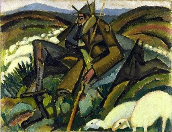 Curator: Henri Le Fauconnier’s oil painting, "Lake", completed in 1911. What strikes you first about it? Editor: The fractured, almost geological forms. It’s like looking at a landscape that’s been deconstructed and reassembled according to a different set of rules. Very unsettling but visually engaging. Curator: Absolutely. Fauconnier was grappling with post-impressionist ideas while maintaining connections to older artistic concerns, such as labor practices and relationships with industrial production in France. He moves us past simple representation of an idyllic scene. Editor: I agree. And these forms aren't simply about imitation; look how the mountains and the water are rendered in planes, reduced to their essential geometry. There's a dialogue between volume and surface, mass and flatness. He challenges our very sense of perspective. Curator: Think about the pigments used. This wasn't some pure vision conjured from the ether. Pigments were produced from industrial mills that used the labor of French factory workers, from material extraction to mixing paints. Editor: Indeed. I’m more fascinated by how Fauconnier deployed color to articulate space and mood. The cool blues and greens of the lake contrast so vividly with the warm ochres and browns of the land. And note how the light is not just ambient; it’s structured. Curator: Structured according to the processes of production. A new, emerging European world in 1911 where art was increasingly being influenced by commercial activity and societal shifts. Editor: True, but ultimately, that all takes a backseat to the artist’s manipulation of form. We are perceiving a flattened representation; it evokes nature, yet calls attention to its constructed status through compositional strategies, light, and color. Curator: I appreciate the insight, focusing on how these paintings offer perspectives beyond aesthetic appreciation to embrace historical, social, and material conditions of its creation. Editor: And I find the painting rewarding precisely because the formal elements transcend historical specifics. Curator: A stimulating divergence! Thanks. Editor: My pleasure.