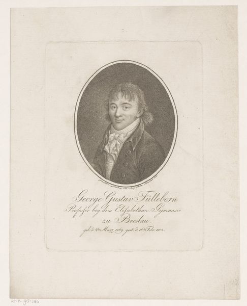 Curator: This is Francisco José de Goya y Lucientes' self-portrait, titled simply "Francisco Goya y Lucientes, Pintor", housed here at the Harvard Art Museums. Editor: There's something about the stark contrast that gives it an almost theatrical quality, doesn't it? The hat especially – it's such a strong, almost cartoonish symbol of status. Curator: Absolutely. The hat, the angle of his face, there's a pride there, but also a hint of melancholy. The text below, "Pintor" or "Painter", is so assertive, like a pronouncement of identity. Editor: And yet, he presents himself in profile, almost as if he’s holding something back from us. The gaze is averted. Was he reflecting on his societal position? Curator: It's Goya staking his claim to posterity, using his own image as a symbol of artistic authority. And that hat, well, it becomes his trademark, a signifier of the artist. Editor: A fascinating assertion of self, carefully constructed for the ages. Curator: Precisely, a persona etched in ink.