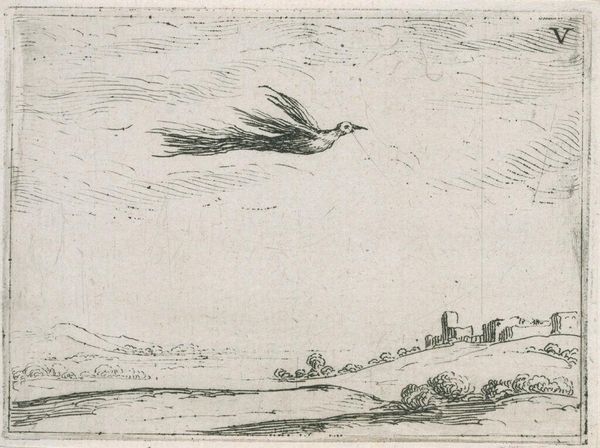 Curator: What a striking scene. This is Jacques Callot's "Crow and the Snail," currently residing at the Harvard Art Museums. Callot was born in 1592 and died in 1635. Editor: It feels ominous! The crow diving, the snail seemingly oblivious. Such a tiny drama playing out in this vast landscape. Curator: The crow and snail are classic symbols of the swiftness of fate versus the slow grind of everyday life. The scene seems deceptively simple, yet it taps into something fundamental about existence. Editor: Right, like a reminder that even in a beautiful landscape, there's always some kind of predator lurking, some kind of threat. It’s a bit unsettling, honestly. But beautifully rendered. Curator: Callot's technical skill brings a certain lightness to the scene, almost a whimsical quality despite the underlying tension. Editor: It's got a dark humor to it, I think. Kind of makes you want to root for the snail, though. Curator: Indeed, a universal story distilled into a miniature world. Editor: Exactly. Makes you think about the underdog—or undersnail—in your own life.