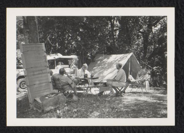 Editor: So, this photograph, by Mathew Brady, is titled "Untitled (General Grant seated under tree…)", and it seems to capture a very casual, candid moment. There is a calmness in the scene. What do you see in this, that I might be missing? Curator: Oh, the beauty is indeed in its deceptive simplicity! I see Brady, ever the storyteller, framing Grant not just as a general, but as a man finding respite amidst war. Notice the tents—symbols of impermanence—juxtaposed with the steadfast tree, a silent witness. What do you make of the smoke rising in the image? Editor: It adds an element of mystery, like unspoken strategies being discussed. It’s almost dreamlike. Thanks, I learned a lot. Curator: Indeed! History isn't just dates and battles, but smoke, trees, and fleeting moments.