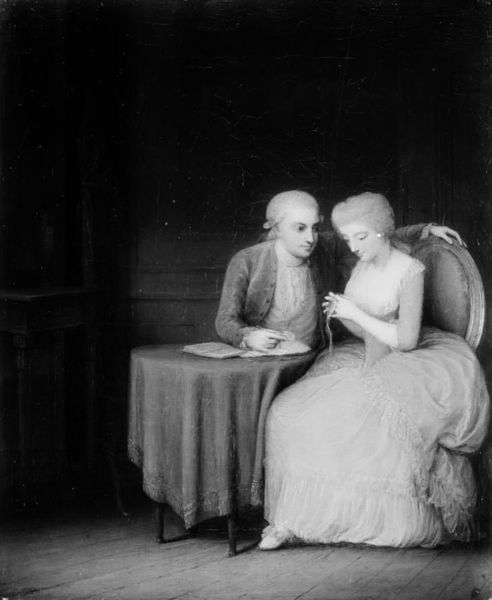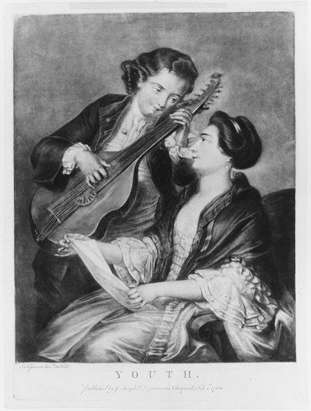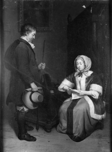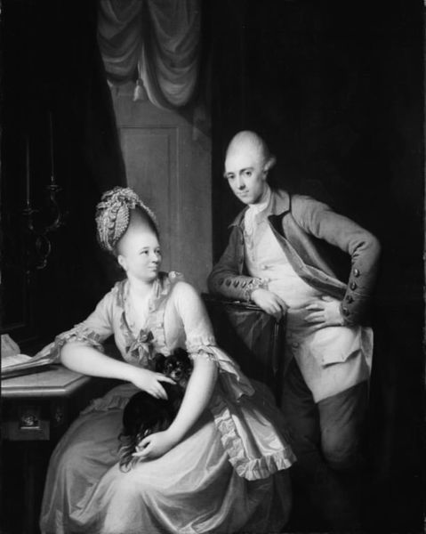 Editor: Here we have Jens Juel's "Peder Anker med hustru og datter," created in 1792 using oil paint on canvas. It has such a formal yet intimate feeling. What jumps out at you when you look at this painting? Curator: Well, I am immediately drawn to the materials and how they reflect the social and economic context. Juel used expensive pigments and canvas. What does that tell us about the subjects? The texture of the clothing, painstakingly rendered, emphasizes wealth. The paper that Anker is holding -- consider its physical properties as a manufactured product and what its presence says about literacy and access to information. Editor: That’s interesting. So the painting becomes more than just a portrait; it’s about access and power expressed through materiality. The detail on the fabric alone must have taken considerable time and skill. Curator: Exactly! The labor involved in producing not just the painting, but also everything depicted *within* it, speaks volumes. Think about the production of those textiles, the mining for pigments... These are all part of the bigger picture. Do you notice the subdued colour palette, almost as if the canvas was scarce and the paints measured? Editor: I do now! It makes me wonder about the social status of artists like Juel. Was he seen as a craftsman, or did his use of these materials elevate his standing? Curator: Good question. The very act of transforming raw materials into something of aesthetic value, something that signifies status, blurs those boundaries. The commissioning of such a piece shows an intentional participation in a visual culture deeply rooted in social hierarchy. We see the materials almost acting as agents here. Editor: It’s fascinating to consider how materials, labor, and class intersect in a work like this. It definitely changes how I view portraits in general. Curator: Indeed! And it moves us away from simply appreciating its aesthetic beauty, encouraging a critical engagement with its broader social and economic implications.