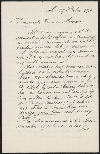 Curator: We're now in front of "Brief aan Pieter Haverkorn van Rijsewijk," a pen-and-ink drawing on paper by August Allebé, dating from possibly 1905-1914. Editor: Immediately, I’m struck by its delicate formality, a private communication made public, almost ghostly in its fragility. The texture of the paper seems crucial. Curator: Absolutely. The controlled lines of the penmanship create a kind of visual grid, playing against the looser flow of the ink itself. Semiotically, the handwriting operates as a trace, an index of the artist's presence. Editor: For me, the letter’s physical presence as an object conjures a lost world of personal correspondence. The act of writing, the texture of the paper – these all become symbols of connection, human interaction across distance and time. What stories might the recipient have read here? What emotions did this script inspire? Curator: The form itself – the careful spacing, the flourishes – contributes to the overall meaning. You could argue that even without understanding the text, the viewer perceives a certain decorum and intention. The graphic quality of each word presents a layered meaning. Editor: I see it as more of an intimate object imbued with the soul of both the sender and the receiver. A tangible representation of trust, hope or maybe even urgency communicated from one mind to another in a past long gone by. Curator: An interesting interpretation. The beauty of this drawing lies in its ambiguity and subjective experience. We read its construction, materiality and layout as symbolic to this time. Editor: Indeed. We see more in its forms than Allebé likely had thought or anticipated in his era of pens and hand delivered post. Curator: Ultimately, “Brief aan Pieter Haverkorn van Rijsewijk” shows how form and symbolism coalesce. Editor: It's a subtle whisper of another time, open for interpretation, revealing something new each time we visit.