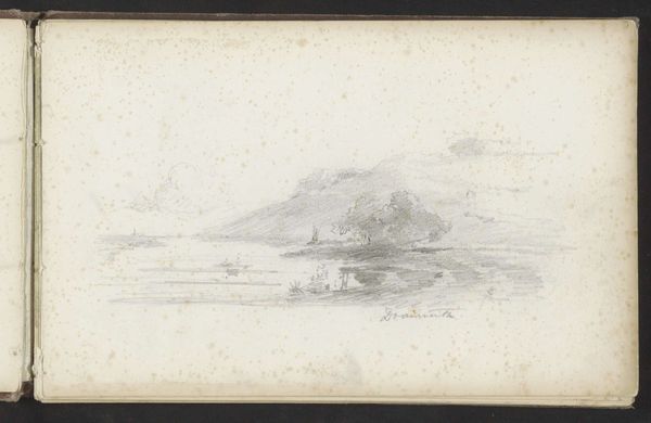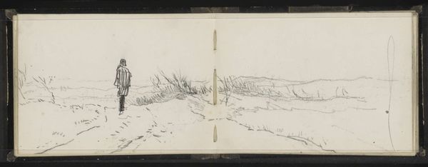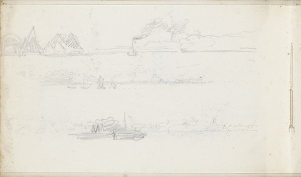 Editor: Here we have Benjamin Champney’s "Partial Landscape," a pencil sketch on paper. I'm struck by the contrast: one side is completely blank, while the other depicts a very serene waterside scene. What do you make of this diptych? Curator: It speaks to the complexities of representation, right? The blank page signifies absence, a void, while the landscape suggests presence, perhaps a colonialist impulse to capture and own nature. The division highlights power dynamics, what is seen and unseen. Editor: That’s fascinating! So, the “partial” nature of the landscape could be a commentary on incomplete narratives? Curator: Exactly. And whose narrative is centered? Champney was part of the White, male-dominated Hudson River School. Whose stories are erased in his landscapes? Editor: I hadn't considered that. Thanks, that gives me a lot to think about! Curator: It's about questioning what we see, and whose perspective it reflects.