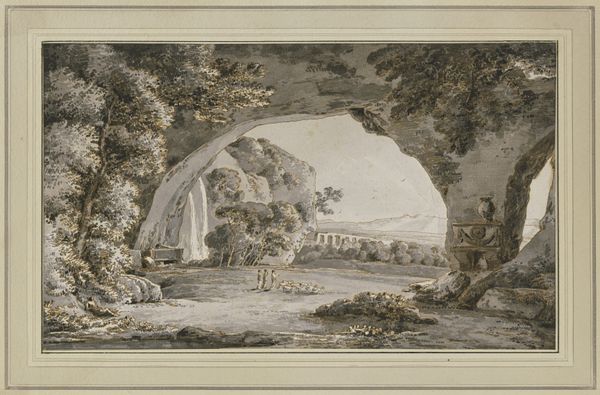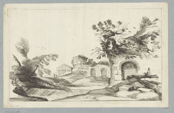 Editor: Abraham Genoels II's "Landscape with Fountain," made using pen, ink, etching, and paper, depicts a serene, almost melancholic scene. The soft grey tones and the crumbling architecture give it a sense of faded grandeur. How do you interpret this work through a socio-historical lens? Curator: That melancholic air you pick up on is key. Genoels, working in the 17th century, was deeply influenced by the political upheavals and social anxieties of his time. Think about what a landscape *meant* then, particularly a constructed one like this, with the fountain and the crumbling structure. Editor: I imagine landscapes being tied to power and ownership... the landed gentry displaying their wealth and status? Curator: Exactly. These weren't just pretty scenes; they were statements about control and dominion over nature and, by extension, society. But notice the "crumbling" aspect you pointed out earlier. The romantic ruins subvert the visual claim to absolute and lasting authority of a family. Who inhabited this landscape? Who benefitted, and who was excluded? How does this composition uphold or subvert class expectations? Editor: The fountain seems to offer a source of life amidst decay... Curator: A poignant observation! It's also important to ask *what* kind of life. The presence of water, historically controlled by those in power, dictates who has access to the basics needed to survive and potentially thrive. Look also at where the water goes and how it is delivered, what that tells us. Editor: That is true. The water could be a false promise, especially considering who likely controlled access to it. Curator: Precisely. And doesn't that reading unfortunately remain relevant today? I appreciate your bringing a keen, fresh awareness to bear on this layered work. Editor: I never thought of landscape art being capable of socio-political messages. It gives me new found respect for the genre.
