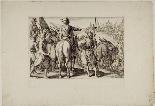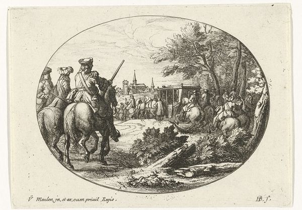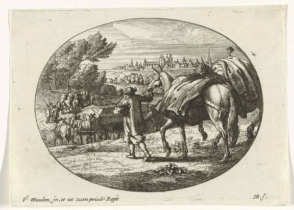 Editor: So this drawing, “Leger en koetsen trekken naar stad,” or "Army and Carriages Moving to the City" is attributed to Jan van Huchtenburg and dated anywhere from 1674 to 1733. It's a pen drawing and engraving currently housed in the Rijksmuseum. There's such dynamic energy in this small oval composition – the horses straining, the city beckoning in the background. How do you interpret its structure? Curator: Focusing on the formal aspects, notice how the artist masterfully utilizes the oval frame. The receding lines of the landscape, from the foreground to the city in the distance, create an illusion of depth within this confined space. Consider, also, the varying densities of line work: the heavier, darker strokes define the forms of the horses and carriages, while lighter, more delicate lines depict the atmospheric perspective. Does the strategic placement of light and dark create any notable contrasts or rhythm for you? Editor: Definitely, the contrast is really striking, particularly how it emphasizes the activity in the foreground against the backdrop of what looks like a siege in progress. I suppose that speaks to its Baroque style as well. Does this Baroque piece, relying so heavily on line, align with typical techniques? Curator: Precisely! While Baroque painting is often associated with rich color and dramatic chiaroscuro, the emphasis on line in this drawing contributes to a sense of movement and dynamism. The use of line lends the image a narrative drive, almost like stills from a longer, unknown sequence. Editor: This examination has changed my perspective on its artistry. It's incredible how much dynamism can be expressed with something as simple as line and composition! Curator: Indeed. By observing how Van Huchtenburg manipulates line and form within the oval composition, we can truly appreciate the artist’s skill.