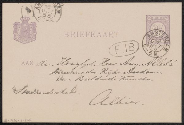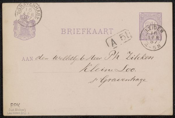 This briefkaart, or postcard, was sent to Philip Zilcken by Anthon van Rappard in 1889, made from commercially produced cardstock. The card itself bears a printed heading and official stamps, indications of a modern postal system and its intersection with everyday life. The message, carefully handwritten in ink, carries a personal touch, yet exists within the framework of mass communication. Consider the labor involved in producing the cardstock, printing the design, and the infrastructure required for distribution. The contrast between the industrialized card and the handwritten message highlights the changing nature of communication in the late 19th century. This seemingly simple artifact encapsulates broader themes of industrialization, labor, and the evolving social fabric of the time. By examining such humble objects, we gain insight into the complex interplay between artistic practice, mass production, and personal expression.