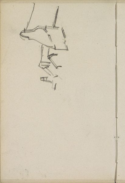 Curator: Before us is Jozef Israëls' "Twee Mannetjes," which roughly translates to "Two Little Men," created sometime between 1834 and 1911, rendered in pencil. What's your first take on it? Editor: Oh, a wisp of a thing, isn't it? Barely there, like a half-remembered dream jotted down on a scrap of paper. They seem a bit comical, these little fellas, though melancholy too, somehow suspended in all that empty space. Curator: Yes, it's striking how the figures are placed so high on the page, dominating it with negative space. Israëls' exploration of light pencil work and his creation of preliminary compositional sketches—these aspects underscore its origins in the idea-generation stage. The visible strokes display an initial attempt at capturing subjects observed. Editor: Idea generation, absolutely! It has the intimacy of peering into the artist's personal sketchbook, a stolen glance at figures that amused or intrigued him. You can almost see him tweaking their poses, the subtle shifts in weight, trying to pin them down just right. Curator: It reflects a moment in the artist's practice, and the medium of pencil lends itself to easy reworking. What resonates, also, is the material reality; graphite harvested, manufactured into pencils, leaving dark matter behind upon the fibers of the paper. The economics and politics of access to these simple tools also speaks to the changing definition of artistic practice in this era. Editor: So true! But beyond that, the figures themselves... they tell their own quiet story, don’t they? Their stooped shoulders, the way they huddle together – are they weary travelers? Or maybe just two souls caught in the everyday grind. It sparks something. A feeling of quiet empathy. Curator: Israëls' background is marked by a shift from grand historical paintings to more intimate portrayals of everyday life, especially themes related to the struggles of the working class, so that tracks. His Realist style, visible in his initial sketchbook art, reflects an amateur yet sincere way of sketching as an approach. Editor: Makes you wonder what stories he intended to tell with them, doesn't it? Or perhaps they’re perfect as they are, a whisper of humanity caught on paper, inviting us to fill in the blanks. It leaves you feeling a bit incomplete, actually...like a question without a satisfying answer. Curator: Well, it is but a fragment. It certainly illuminates aspects of artistic labor that might normally be obscured. Editor: Precisely. Food for thought, this fleeting glimpse. A humble creation, yet rich with possibilities.