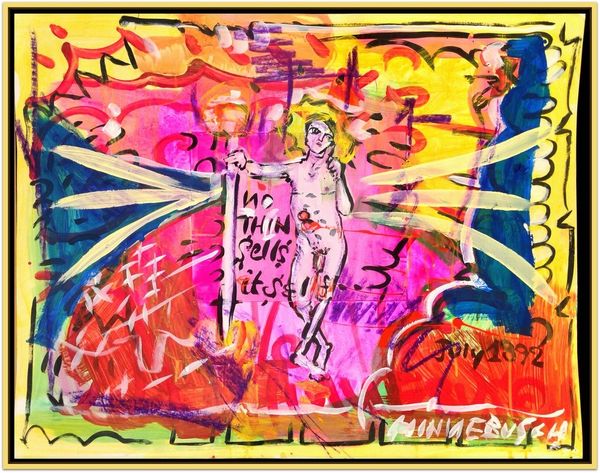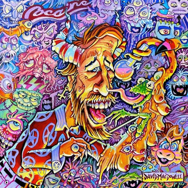 Curator: Gaze upon this riotous tableau, this "CULTURE WARS" by Dave Macdowell. It's a vibrant mixed-media work, drenched in acrylic, seemingly bursting at the seams. What strikes you most about it? Editor: Well, it’s definitely intense! There’s so much going on – a mix of familiar cartoon characters with... well, more adult themes. I’m almost overwhelmed by how much it throws at you. What do you make of this chaotic composition? Curator: Chaos is the point, isn’t it? Macdowell has crafted a visual feast—or perhaps a visual assault—that's incredibly compelling. It’s Pop Surrealism dialed up to eleven, crammed with appropriation, dripping with figuration. Look at how he layers the saccharine sweetness of pop culture atop darker, more suggestive imagery. Do you think there’s a push and pull there? A deliberate collision? Editor: Definitely a collision! The ‘Scooby Doo’ butts juxtaposed with that… that bondage image? It feels deliberately provocative. Like a comment on how our childhood innocence gets corrupted, or maybe repackaged in a very disturbing way as we grow up. Curator: Precisely! "Youth is wasted on the youthfull!" It’s as though Macdowell is inviting us to question the very narratives we consume. Are we passive viewers or active participants in the "movie" we’re living in, as the text suggests? That television, spewing forth the bizarre detritus of our times, is it reflecting us, or dictating us? Editor: I see that now, this is not mere randomness! Thanks, now I feel less like I'm drowning in visual noise and more like I'm actually seeing something. Curator: And isn't that the beauty of art? It holds a mirror up to our world, no matter how fractured and absurd, daring us to really look. And of course, for us to draw our own conclusions from what we see.