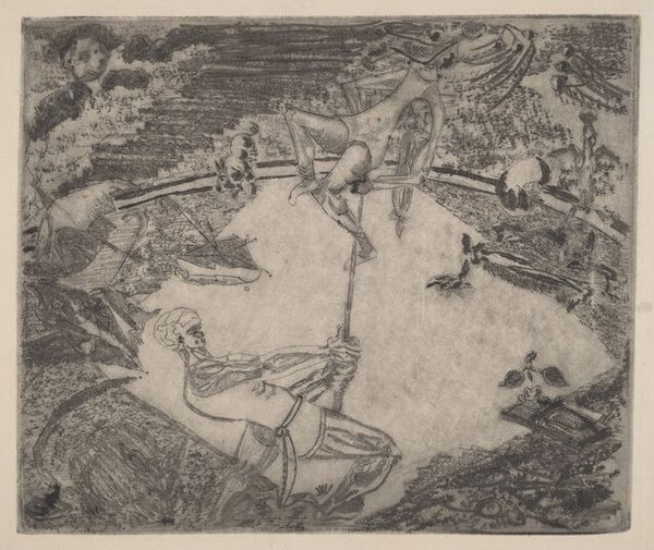 Editor: Here we have Imre Reiner's 1932 etching, "The Giaour: Title Page." It has a melancholic, almost ruinous quality. What jumps out at me is how the geometric forms intersect with the organic shapes of the foliage. How do you interpret this work, particularly concerning its composition? Curator: The effectiveness of this print lies precisely in that tension. Observe the stark contrast between the sharp, deliberate lines forming the fallen architectural element and the more fluid, less defined lines of the surrounding vegetation. It’s a binary – geometric versus organic, order versus chaos – visualized through line quality. Editor: Yes, I noticed the interplay between the architectural ruin and foliage. It's very pronounced. Curator: Note, too, the tonal range. Reiner employs subtle gradations of grey to give depth to the foreground, drawing the eye, and rendering the background building a lighter tone to enhance depth and perspective. Editor: It's clever how he leads the viewer through the work. Curator: Indeed. Ask yourself, how does the formal arrangement create a dialogue about decay, ruin, or perhaps, resilience? What does the strategic use of line and tone communicate about the artist's intended meaning? Editor: I hadn't considered resilience, but it’s interesting how the foliage, despite the ruin, suggests a continuation. I was caught up on the idea of entropy and decay, thank you! Curator: Precisely. The work becomes a fascinating case study of binaries, contrasting order and disorder. Thank you for your thoughtful observations.