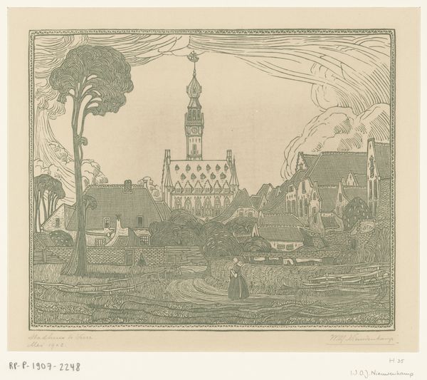 Editor: This pen and ink drawing by Hermanus Numan, created sometime between 1754 and 1825, is called "Beëdiging van het Regeringsreglement op de Grote Markt te Haarlem in 1787." It depicts a cityscape within a circle. It reminds me of a commemorative coin or an official seal. What do you see in this piece? Curator: It’s fascinating how Numan uses the circular format, framing this historical event as both a contained moment and something potentially circulated and disseminated. We're seeing the swearing-in of the new Haarlem government in 1787 after the Patriot revolution was suppressed, which resulted in the Orangists regaining power. The drawing's style, the clean lines, the neoclassical architectural elements—the domed structure and the grand church—they all suggest an attempt to project stability and legitimacy onto the new regime. Editor: So, it's like a visual piece of propaganda? The art style lending credibility to the event? Curator: Precisely. Neoclassicism was often employed to evoke the perceived virtues of the Roman Republic, connecting this contemporary event to ideas of order, reason, and tradition. The choice of such a public space as the Grote Markt, filled with linear formations of soldiers, further emphasizes the state's power and control. Consider how public art like this plays a key role in constructing a specific narrative and influencing public opinion. What effect do you think that might have had at the time? Editor: I guess it would depend on whether you were an Orangist or a Patriot! If you supported the Orangists, it would be a satisfying image of order restored. But if you were a Patriot, it could be a bitter reminder of defeat. It’s a drawing, so how would it have circulated? Curator: Good point. Although a drawing, we could ask if it would later be developed into a print. Editor: I see what you mean. It gives the event a kind of official stamp. Thanks, I never considered how the artistic style and the public setting were so intertwined with political messaging. Curator: Indeed. It reveals how art isn't just a reflection of history, but an active participant in shaping it.