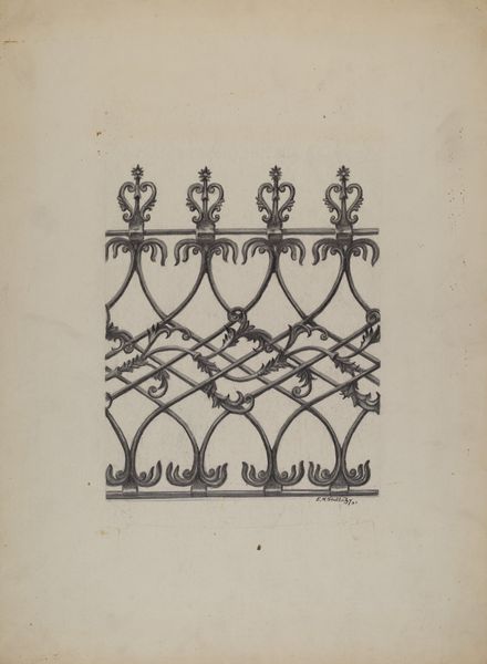 Editor: Here we have "Gate," a drawing by Charlotte Angus, made with ink on paper sometime between 1935 and 1942. The level of detail is captivating! How can we interpret its style through a Materialist lens? Curator: I am particularly struck by the implications of depicting decorative ironwork, and by extension, considering what kind of social class or system employs artisans who are trained to produce this gate's highly stylized lyre, scroll, and floral forms. What statements about power dynamics are embedded in the production and consumption of these images? Editor: So, focusing on the labor involved rather than just the aesthetic quality? Curator: Precisely. Consider the physical process, too. Ink on paper offers precision, mass reproducibility. Was this design intended for broader dissemination, perhaps in a catalogue for prospective wealthy clients? The means of reproduction shift its meaning entirely. Editor: I see... it becomes less about individual craftsmanship and more about accessibility for a specific market. The ironwork itself, though, it's permanent. This is a record of the process and labor involved. Curator: Right. That permanent physicality also speaks to notions of class and stability in 1930's. While the drawing captures the ornate gate on paper, imagine the difference if it were textile instead, perhaps printed en masse. Each evokes a vastly different story about production, value and function. The work invites us to explore how anxieties around production were manifesting in this period. Editor: That makes so much sense! I've never thought of analyzing decorative arts in this way, by focusing on production and consumerism first, then drawing implications of value, status, and social messages. It recontextualizes everything! Curator: Indeed, a focus on the material underpinnings allows us to really dissect the deeper, embedded narratives present in artwork beyond surface appearance and into power dynamics.