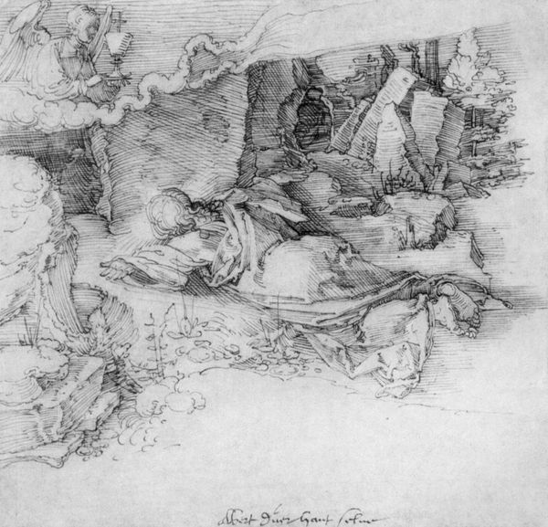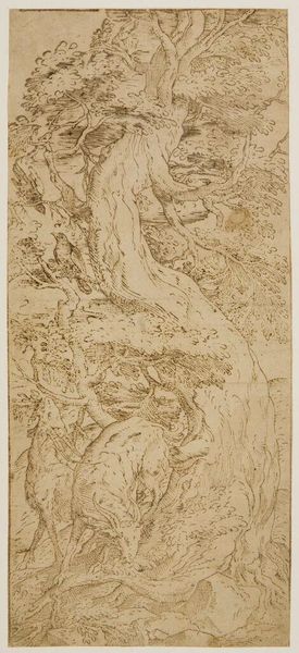 Editor: Here we see an anonymous drawing titled "A Wooded Hillside." It's a small work on paper with delicate linework. How do you interpret the artist's use of line and space? Curator: Note the strategic deployment of varied line weights, which articulates depth and texture. Observe how the artist uses hatching to model the hillside and suggest volume. The spatial arrangement, too, guides the eye. What structural elements stand out to you? Editor: I see how the diagonal of the hill leads to the structure at the top, creating a focal point. The artist seems to be more focused on the slope than the background. Curator: Precisely. The formal arrangement emphasizes the dynamism of the natural forms, even suggesting a certain topographical instability. The artist is less interested in representing the details of the background buildings. Editor: That’s a great observation. I hadn't considered the implied movement inherent in the composition. Curator: Indeed, it compels us to contemplate the very act of perception and the interplay of form and function.