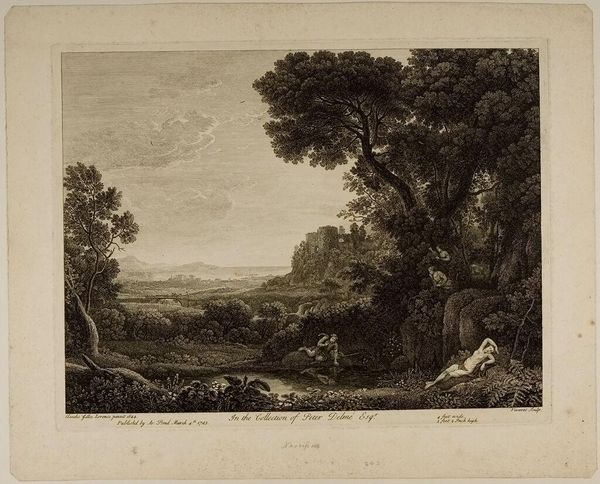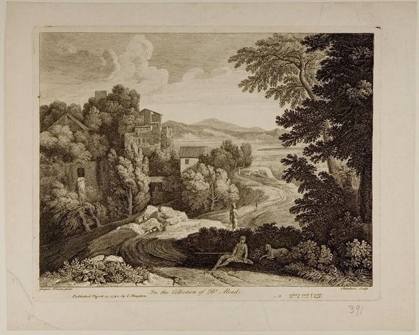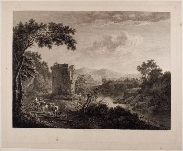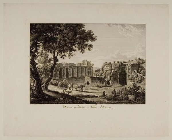 Curator: This is John Pye the Younger's "Temple of Jupiter in the Island of Aegina," currently held in the Harvard Art Museums. It evokes such a classical, serene scene, doesn’t it? Editor: It certainly romanticizes power and leisure. The Temple, the figures in classical dress...it all feels like a statement about cultural inheritance, albeit one that perhaps ignores the labor and conquest that built such temples. Curator: Precisely! The temple itself, dedicated to Jupiter, embodies Roman authority. These sites were focal points, not just for worship, but for societal governance and communal identity. The composition subtly alludes to those hierarchical power structures. Editor: The staging of figures and the temple's dominance bring to mind questions about the representation of power and the inherent biases in how history is visually conveyed through romanticized art. Curator: Absolutely, and consider how the artist uses the landscape to reinforce this. The orderly procession up to the temple implies a natural order, a divinely sanctioned hierarchy. Editor: While the symbolism of the temple represents power, it's essential to deconstruct the narratives these images promote, questioning whose stories are being told and whose are being erased. Curator: It truly encourages us to contemplate the multilayered historical connotations imbued in classical themes and their enduring resonance. Editor: Indeed, and by recognizing these dynamics, we can approach such art with a more informed, critical perspective.