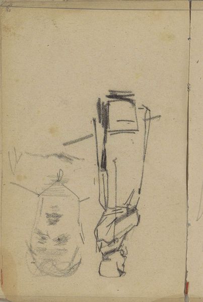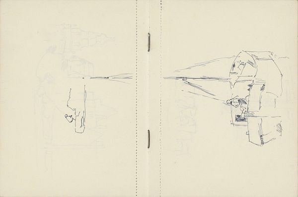 Curator: Cornelis Vreedenburgh, between 1890 and 1946, captured this landscape on paper using pencil and ink. The artwork titled "Studie" currently resides here at the Rijksmuseum. What strikes you initially about this drawing? Editor: It's raw, almost fragile. Like a whisper of a landscape fading into the paper itself. It has the fleeting feeling of capturing a fleeting moment, before the artist could quite nail it down. Curator: Precisely. Sketchbooks, like the one used here, serve as intimate spaces for artists. A reservoir of visual ideas. I note the prominent inclusion of hand-lettering in addition to the landscape. Do these letters, to you, convey an additional symbolic quality? Editor: Absolutely, the lettering has a nervous energy – sharp, dark lines compared to the fainter landscape. Like the artist is urgently trying to define the feeling that this landscape is conjuring. It’s a conversation between image and word, neither quite settled. Curator: A dynamic tension is established then. One could interpret it as the artist simultaneously perceiving and labeling his perception. The act of drawing, the act of naming. This duality seems especially relevant when the word seems incomplete. Editor: Right, the incompletion lends the drawing its intimacy, because you are witnessing this in real time. Also the word itself seems important to decipher…like a clue that will fully conjure what he meant. Curator: There are indeed significant gaps, artistically and linguistically. This fragmentation is echoed across multiple artistic interpretations of the natural landscape from the modernist period. Vreedenburgh captures more than a physical place; he presents the psychology of seeing. Editor: It also strikes me as modern for being so vulnerable. Not quite being a “finished piece”. These preliminary artworks often offer such honest access to an artist’s process, maybe even more honest than more polished statements. I am happy we get to observe it in this way. Curator: A privilege it is indeed. Such initial explorations and expressions often open to us further dialogue with the self, a self reflected in time. Editor: I like that thought. Seeing these drawings makes me want to fill a notebook and maybe fail wonderfully like Vreedenburgh!
