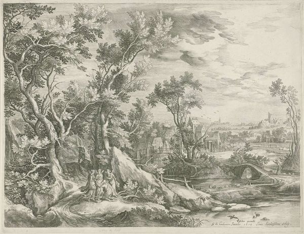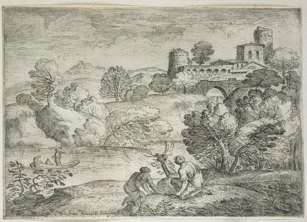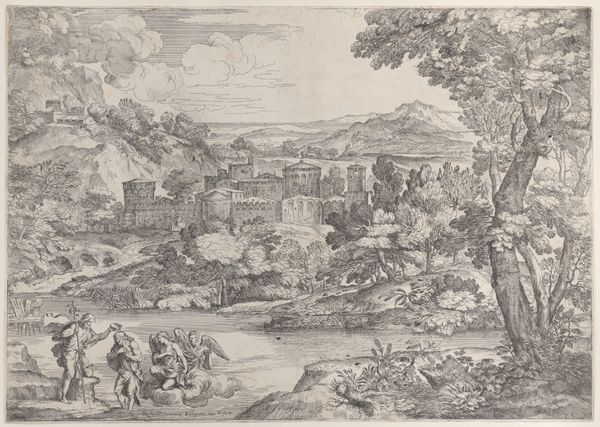Editor: Here we have "Landscape with Five Figures," attributed to Franciscus de Neve, dating from around 1616-1708. It's a pen drawing with very delicate lines. I'm struck by the contrast between the detailed foreground and the vast landscape in the background. How do you interpret this work, particularly its depiction of humanity within such a landscape? Curator: This drawing provides a window into how 17th-century artists grappled with representing the relationship between humanity and its environment, and prompts critical questions about power dynamics. Notice the figures' small scale against the imposing architecture. It brings to mind discussions surrounding colonialism, doesn't it? Considering the historical context of the Dutch Golden Age, do you see echoes of exploration and domination in this picturesque scene? Editor: I see what you mean! The figures seem almost dwarfed, but you're suggesting it might not be just a stylistic choice. It could be commentary on humankind's relationship with the land itself. It's like... are they part of the landscape, or are they trying to control it? Curator: Precisely. The ruined buildings also imply the passing of time, a sort of pre-industrial ruin porn. This connects with today’s critical dialogues about the enduring legacies of cultural and environmental transformation and prompts further conversation about humanity’s lasting impact on the Earth, right? Editor: That makes me think about how often landscapes, especially during that time, were used to signal ownership and power, a sort of... visual claim over the territory. It adds a completely new layer. Curator: Exactly! We’ve unearthed complexities surrounding landscape representation, power, and the enduring effects of the human footprint on the world, encouraging an understanding of the intertwined layers embedded in a seemingly simple landscape drawing. Editor: I didn’t anticipate such rich insights from this simple drawing. Now, I have many starting points for deeper reflection.