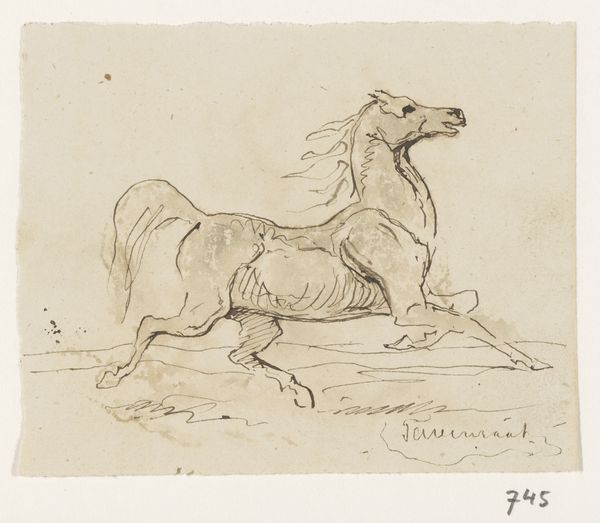 Curator: Johannes Tavenraat’s drawing, titled “Paard”—that's “Horse” in Dutch—created sometime between 1840 and 1880, is rendered in ink, using both pen and brush techniques. It's currently housed here at the Rijksmuseum. Editor: Wow, look at that energy! It feels like the horse is about to leap right off the page. There's something almost unfinished about it, like a fleeting glimpse captured in ink. Curator: The sketch certainly privileges movement, doesn't it? Notice the economy of line, how Tavenraat captures the musculature and dynamism of the animal with such a minimal, almost calligraphic approach. It's realism distilled. Editor: It’s funny; "realism" feels a bit strong. The horse seems less anatomically precise and more about conveying the raw feeling of a horse running wild. There’s this beautiful blurring around the legs—it almost gives the sense of speed. It looks like the horse embodies that powerful tension between freedom and constraint. Curator: An interesting perspective. The contrast in linework does create a captivating tension. See how the body has more solid, defined contours, while the legs fade into gestural strokes—perhaps symbolizing the horse's grounded power against its desire for unbounded motion? It’s a binary the artist expertly encodes through formal means. Editor: Perhaps. Or maybe the artist was just trying to give an impression of speed and got a little impatient near the hooves! Still, I agree, it makes me think of the power of suggestion and imagination. Sometimes, the things that are left unsaid, or in this case, undrawn, speak the loudest. Curator: Ultimately, “Paard” provides a striking demonstration of how line and form, however sparse, can communicate so much about the natural world. Editor: Indeed, and how the artist's own hand, his touch, gives the image such life beyond simple representation. I could stare at it for days.