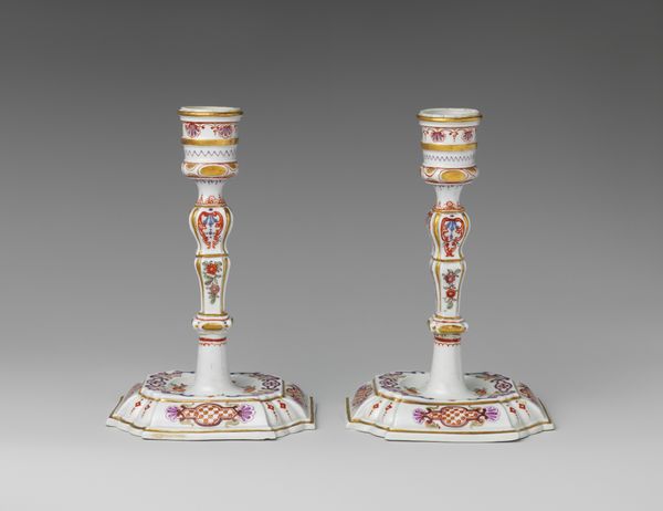 Curator: Here we have a pair of bronze candlesticks crafted by Asprey in 1851, currently held at the Metropolitan Museum of Art. What are your first thoughts? Editor: Elegant and perhaps a touch excessive? The gilt bronze practically glows, and those green stone inlays add a definite pop. They look quite ornate. Curator: Ornate, yes, fitting for the Victorian era when Asprey catered to a wealthy clientele eager to display their status. These weren't just functional objects; they were statements. Consider the foundry work necessary to cast such intricate detail in bronze, and then gild it! It speaks to a high degree of specialization of labor and the industrial capabilities of the time. Editor: And the use of bronze, even when gilded, hints at a specific kind of aesthetic. Bronze has this heft and permanence, a visual language that resonates with the socio-political atmosphere of stability. Curator: Precisely. These objects become symbols of a confident empire. The original owners of the candlesticks undoubtedly displayed them prominently in their home, possibly alongside other luxurious items acquired during the period of heightened industrialization and global trade. Editor: The candlesticks remind us of the grand interiors of the period, often illuminated by candlelight, reflecting off similarly gilded mirrors and picture frames. It wasn't just about possessing objects; it was about constructing a spectacle of wealth and power. We can imagine these gracing the dining table during formal gatherings. Curator: Their existence reflects not just the wealth of the patron, but also the artistry of the workers involved. Asprey outsourced and assembled creations by specialized laborers from multiple studios, with individuals responsible for the casting, chasing, gilding, and setting of the green gemstones that add vibrant pops to the gold of the candlestick. These works were highly collaborative across material disciplines, moving the process beyond a sole artistic vision. Editor: Indeed, thinking about their display prompts reflections on the curated life of the wealthy in that era. Thanks for shedding light on the historical context and shedding light on its artistic roots. Curator: Thank you. Exploring art through its materials always reveals something unique and gives you new appreciation for objects.
